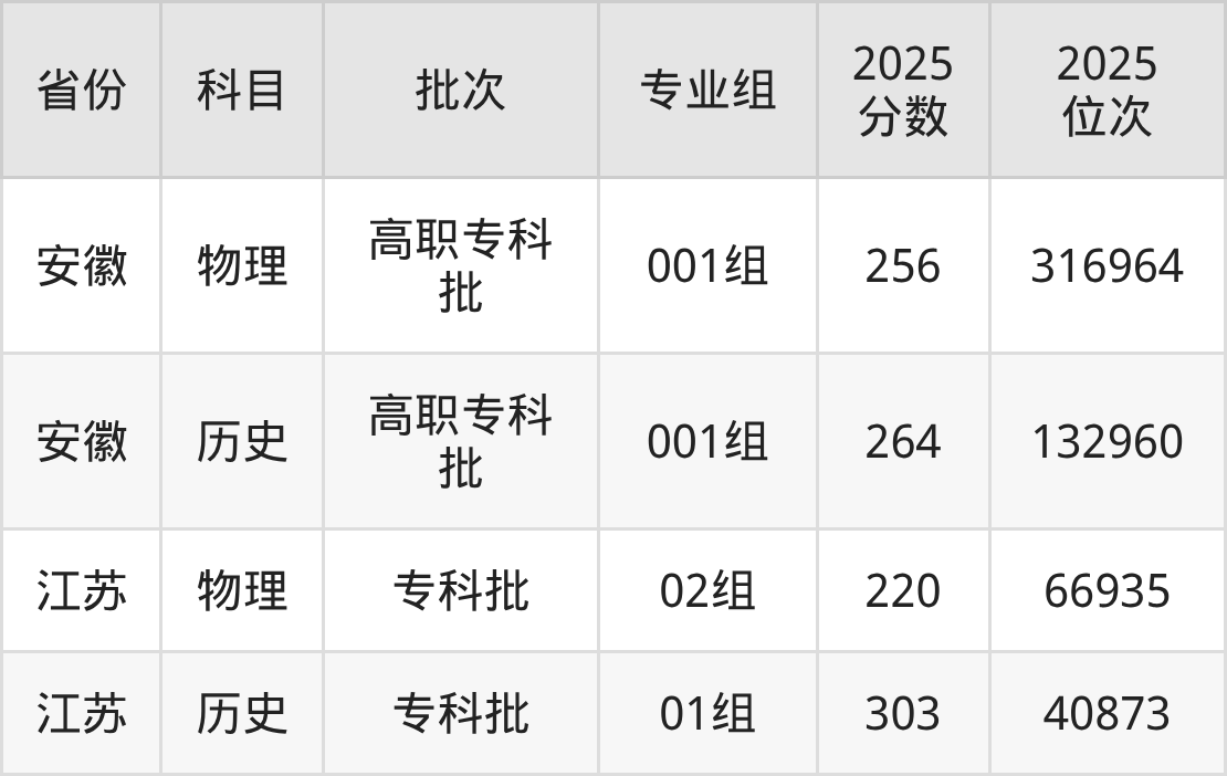 普通类专科历史类最低303分,专科物理类最低220分