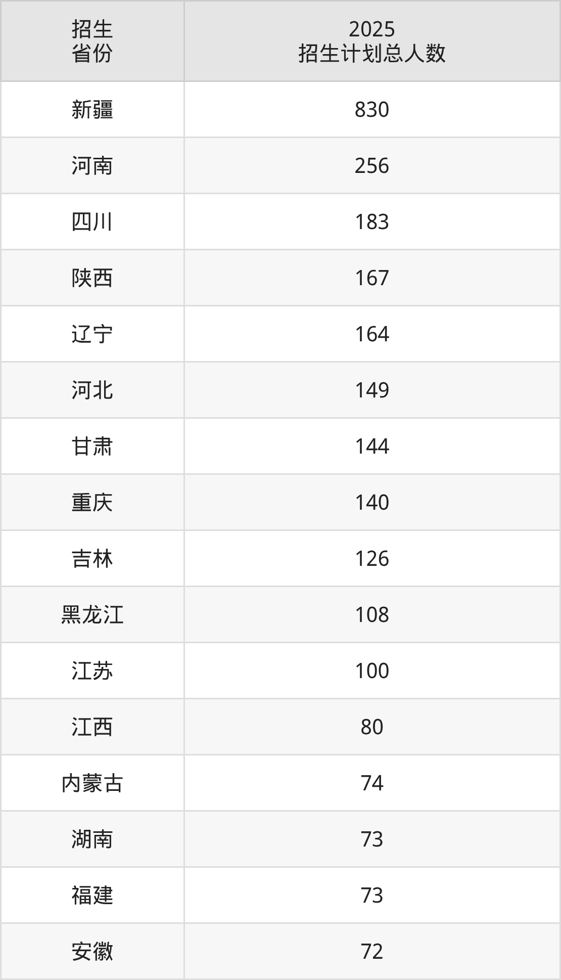 2025年新疆政法学院面向全国28个省市开展本科招生;招生专业共32个,招生人数共3130人。2025年在新疆维吾尔自治区招生计划总人数是830人,其中,新疆政法学院在新疆维吾尔自治区招生人数最多的是计算机科学与技术。新疆政法学院在各省具体招生人数情况如下表。