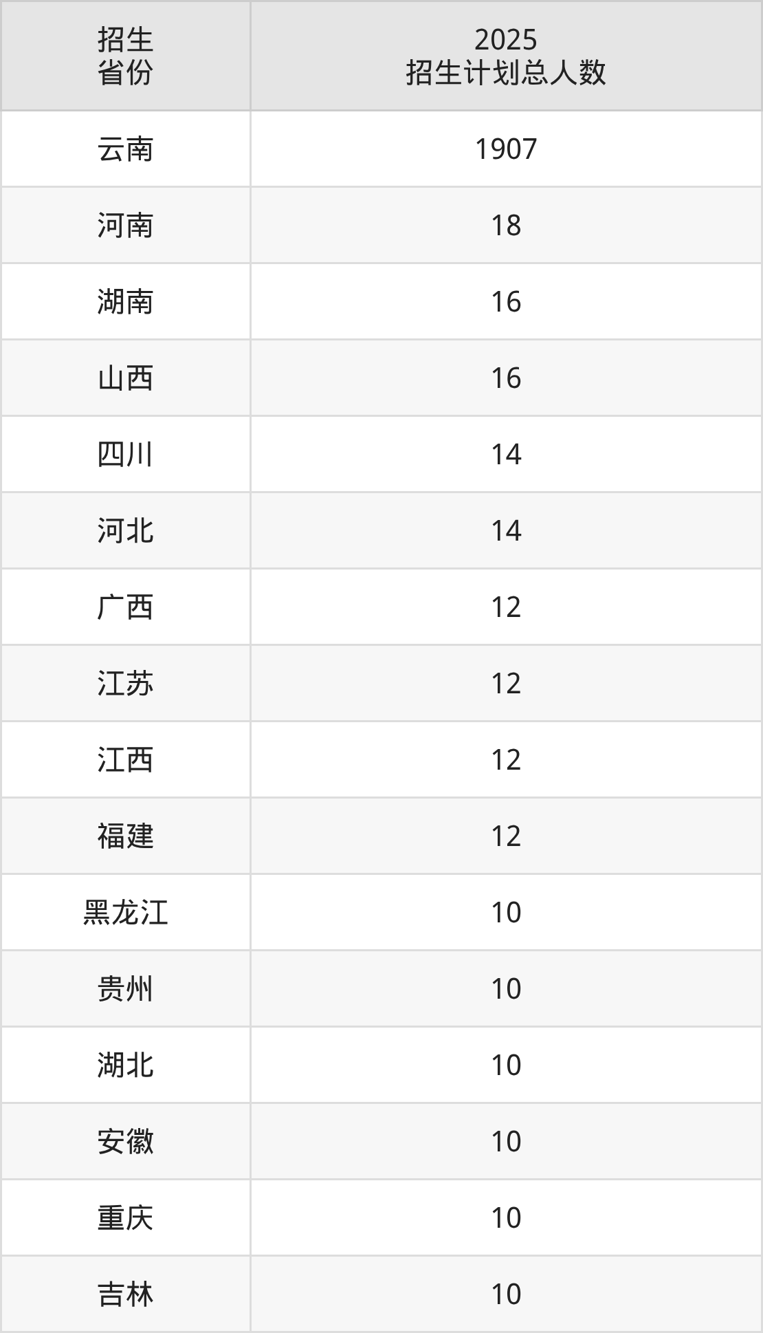 2025年玉溪师范学院面向全国22个省市开展本科招生;招生专业共34个,招生人数共2145人。2025年在云南省招生计划总人数是1907人,其中,玉溪师范学院在云南省招生人数最多的是数学与应用数学。玉溪师范学院在各省具体招生人数情况如下表。