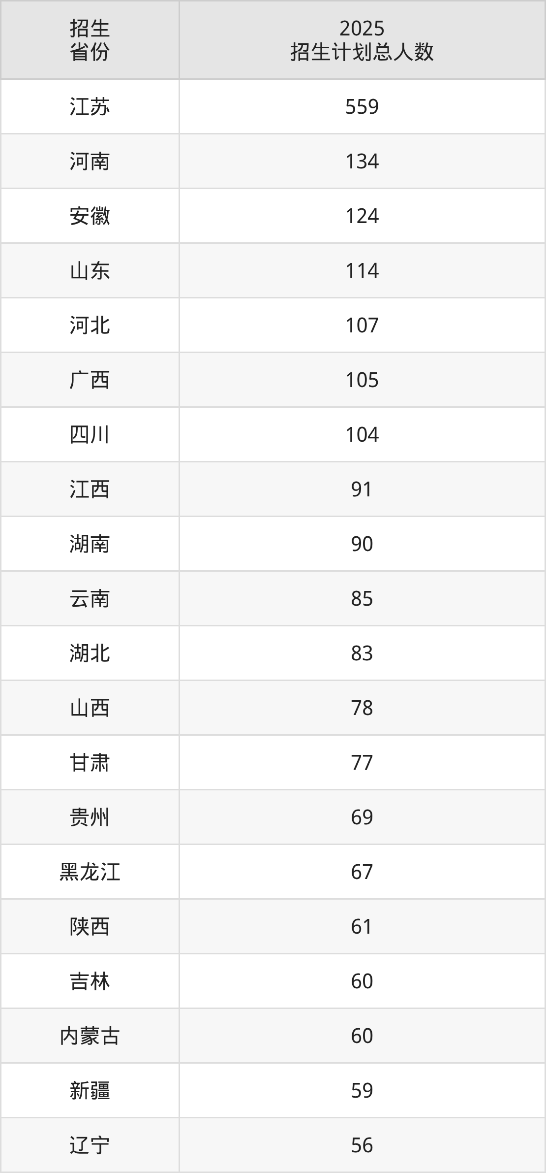 2025年中国药科大学面向全国29个省市开展本科招生;招生专业共20个,招生人数共2556人。2025年在江苏省招生计划总人数是559人,其中,中国药科大学在江苏省招生人数最多的是药学类。中国药科大学在各省具体招生人数情况如下表。