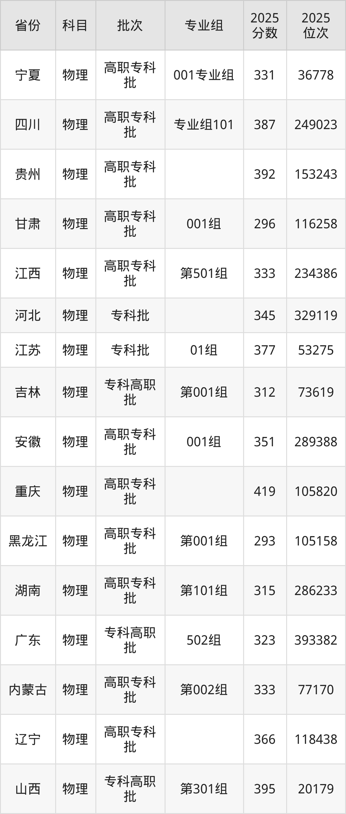 2025年在专科物理类进行招生,各专业组分数线详情如下: