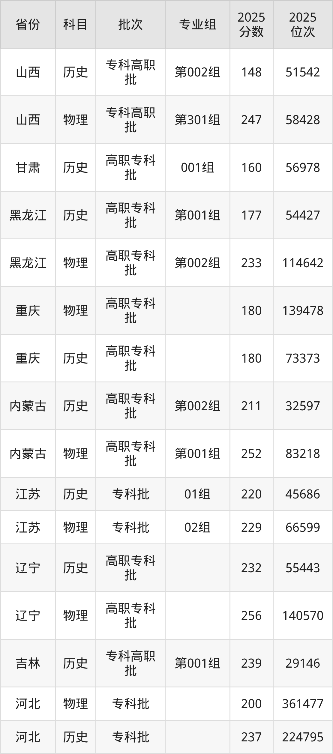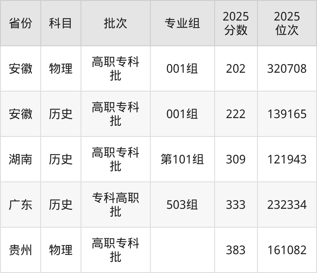 2025年在专科物理类进行招生,各专业组分数线详情如下: