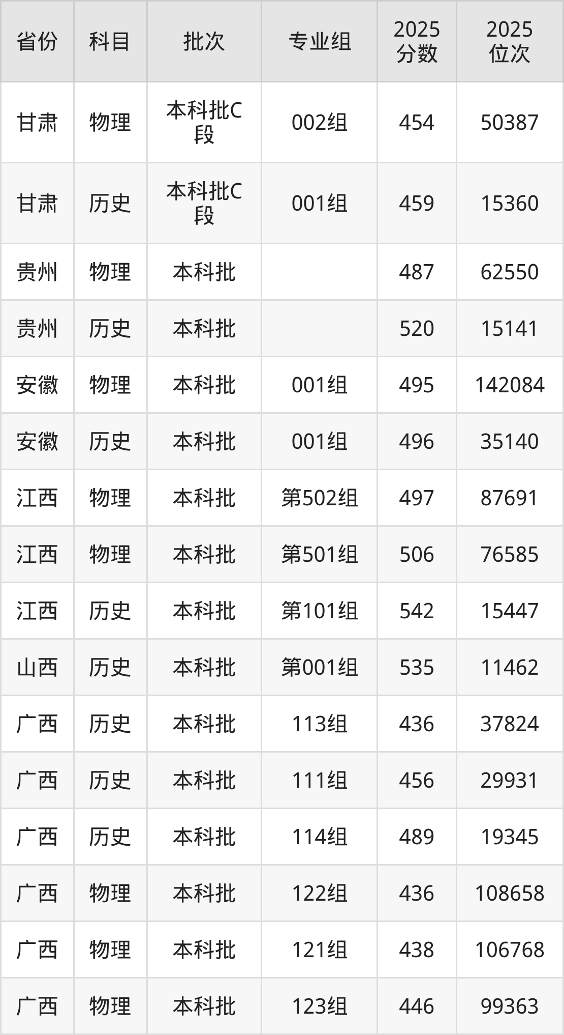 2025年广西警察学院全国录取分数线是436分到542分,录取最低在广西物理类(122组)、录取最高在江西历史类(第101组)。各省各专业组最低分具有差异,详情如下: