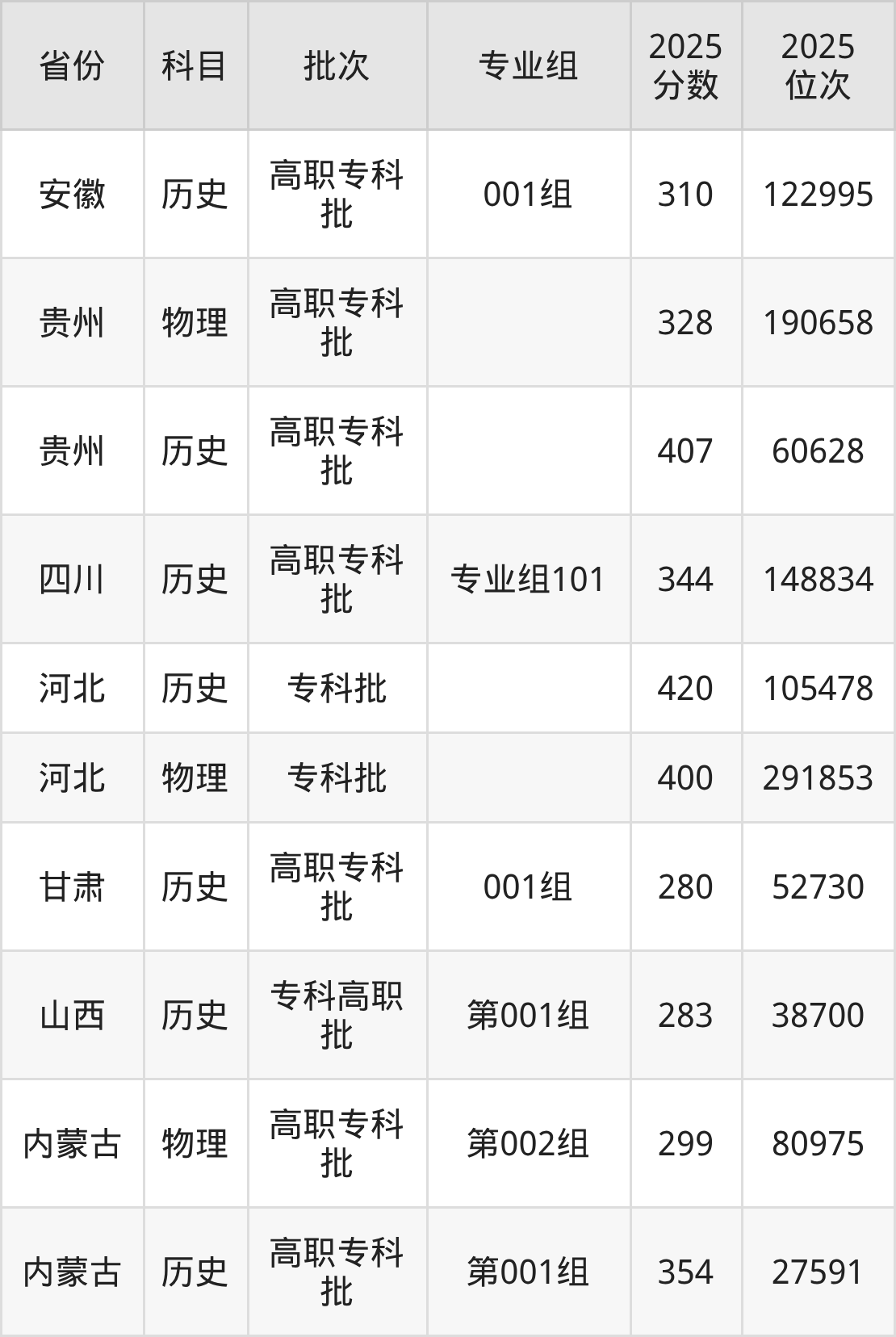 2025年在专科历史类进行招生,各专业组分数线详情如下: