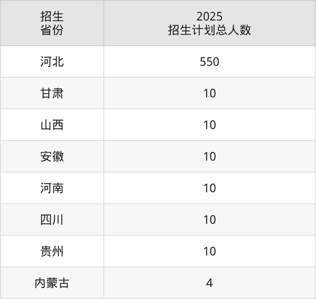 2025年河北正定师范高等专科学校面向全国8个省市开展专科招生;招生专业共9个,招生人数共614人。2025年在河北省招生计划总人数是550人,其中,河北正定师范高等专科学校在河北省招生人数最多的是小学教育。河北正定师范高等专科学校在各省具体招生人数情况如下表。