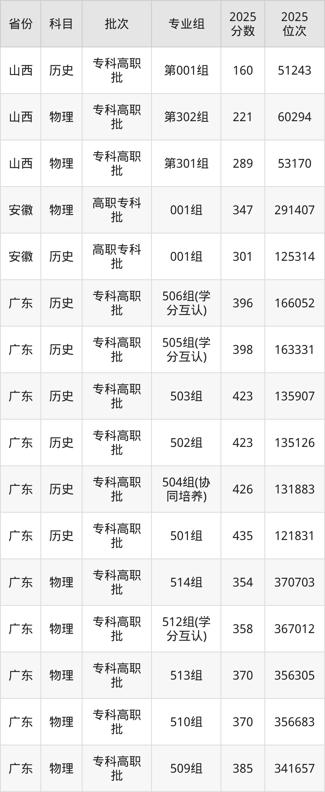 普通类专科历史类最低301分,专科物理类最低347分