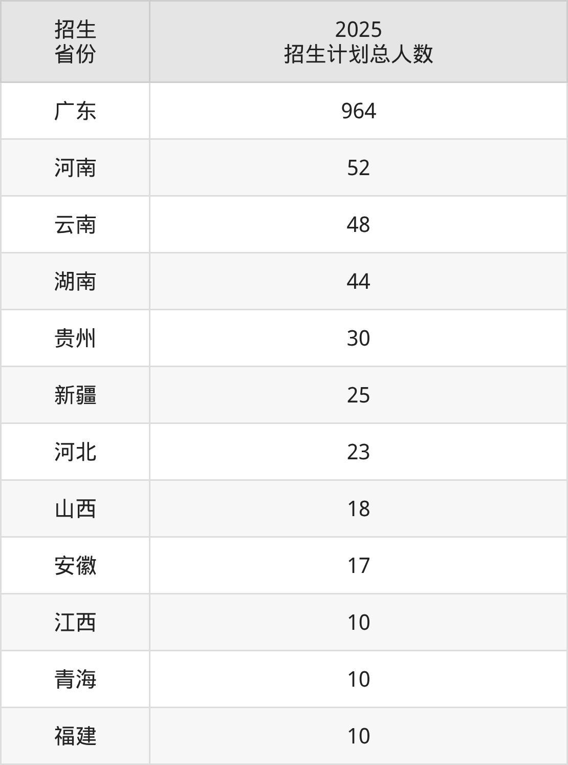 2025年河源职业技术学院面向全国12个省市开展专科招生;招生专业共37个,招生人数共1251人。2025年在广东省招生计划总人数是964人,其中,河源职业技术学院在广东省招生人数最多的是食品质量与安全。河源职业技术学院在各省具体招生人数情况如下表。