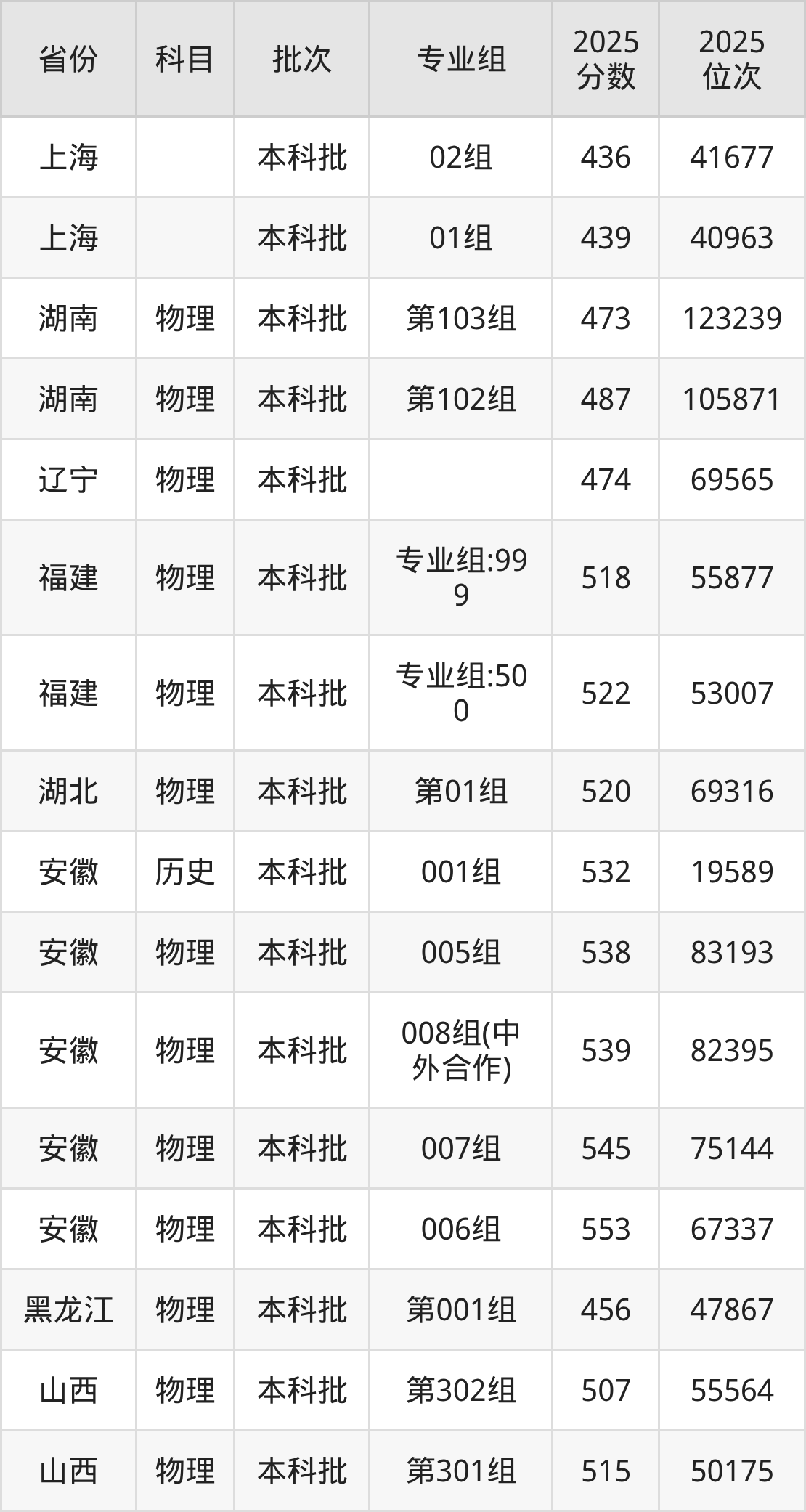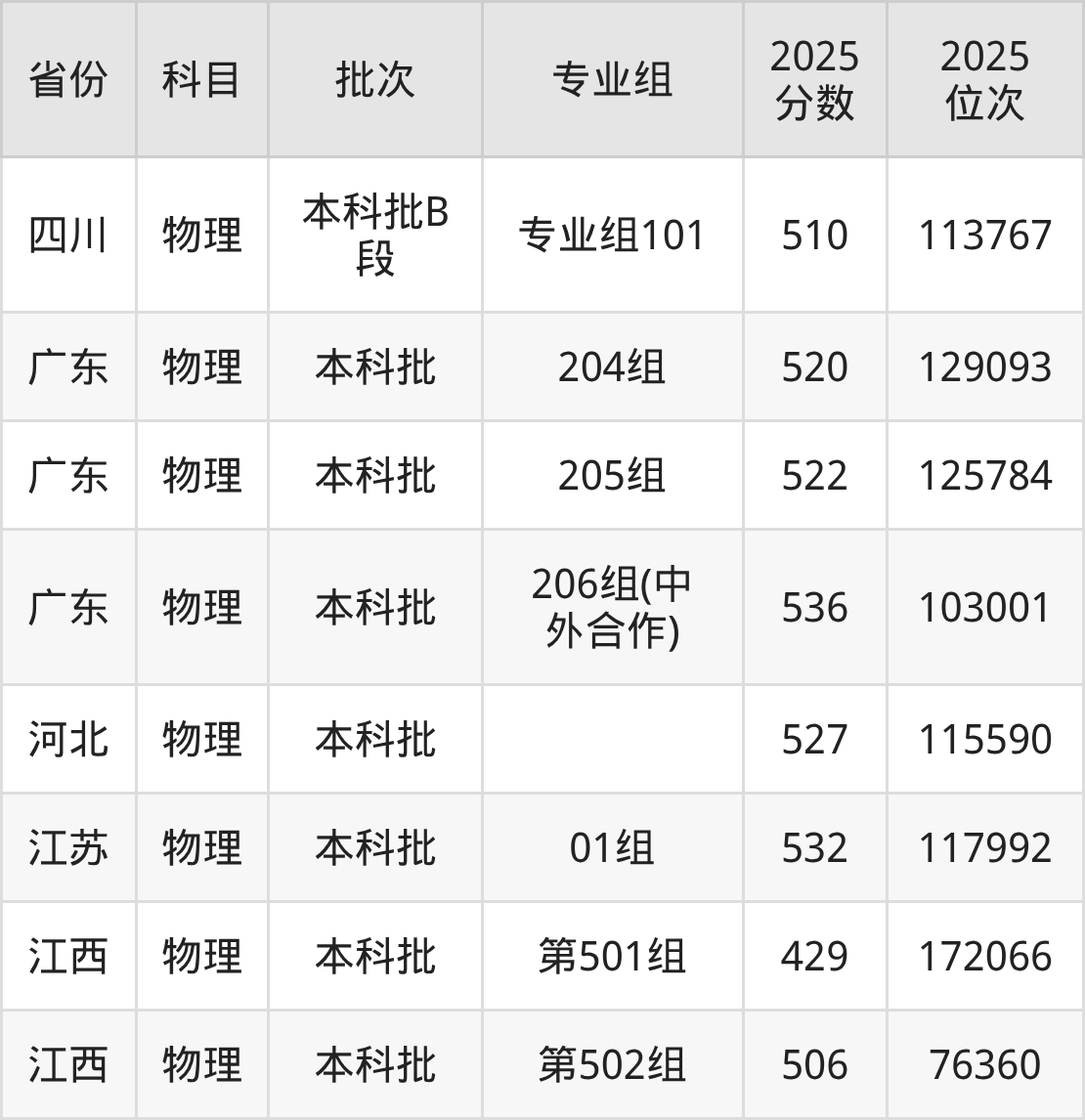 2025年在本科物理类进行招生,各专业组分数线详情如下: