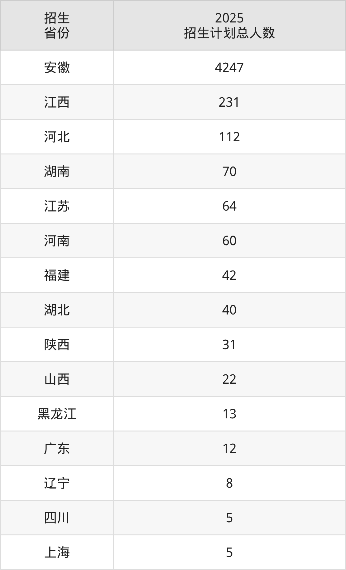 2025年安徽工程大学面向全国15个省市开展本科招生;招生专业共52个,招生人数共4962人。2025年在安徽省招生计划总人数是4247人,其中,安徽工程大学在安徽省招生人数最多的是机械设计制造及其自动化。安徽工程大学在各省具体招生人数情况如下表。