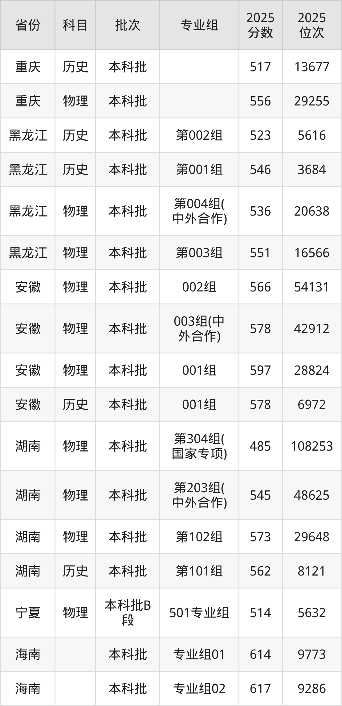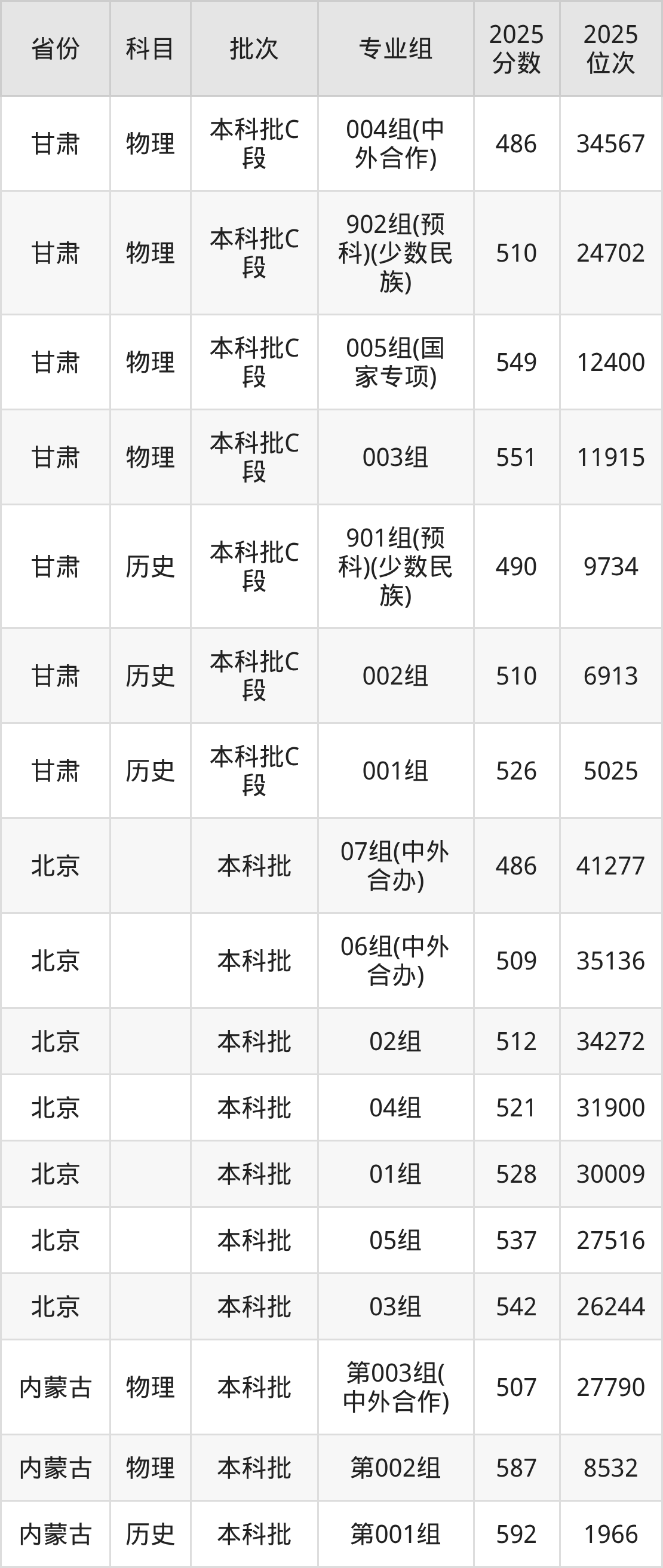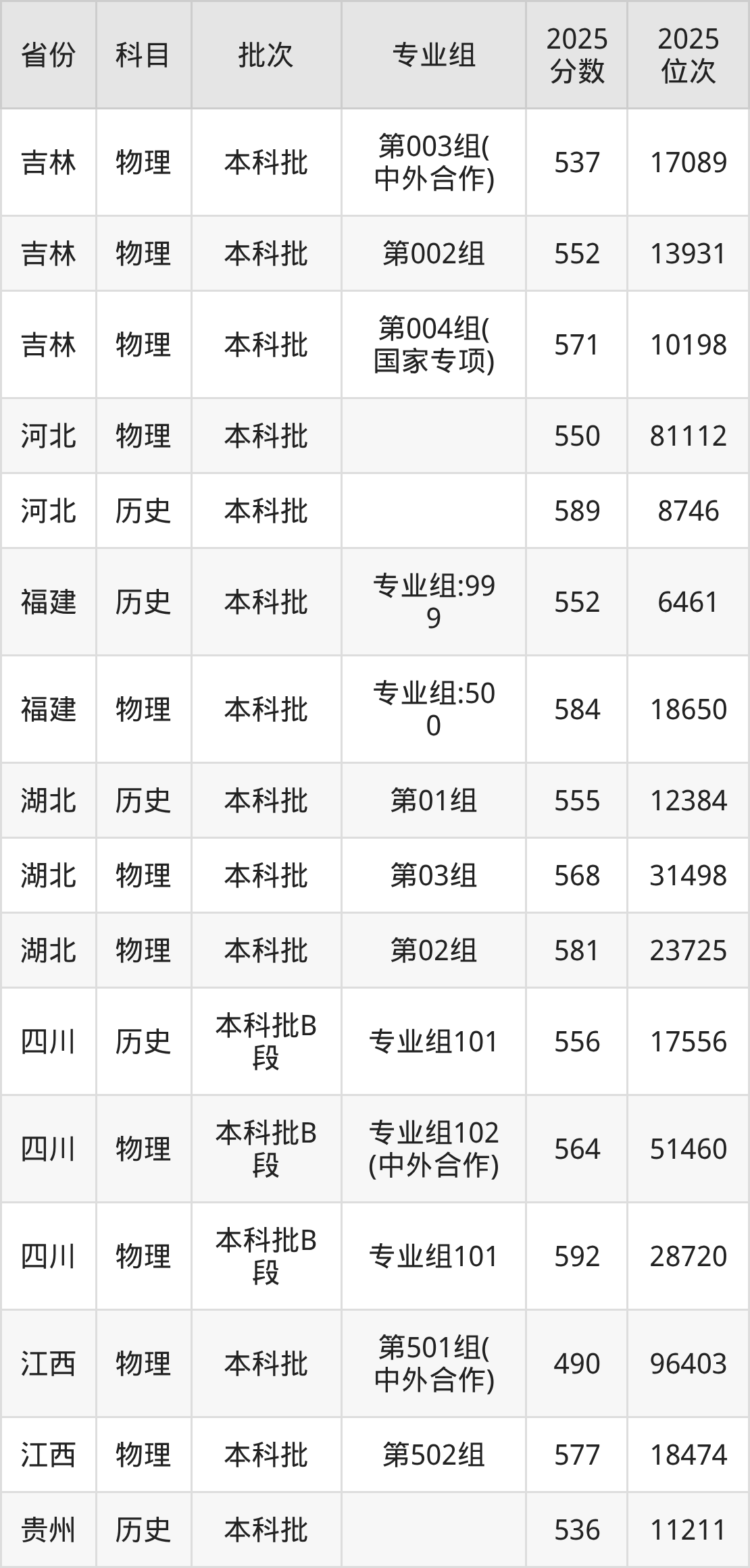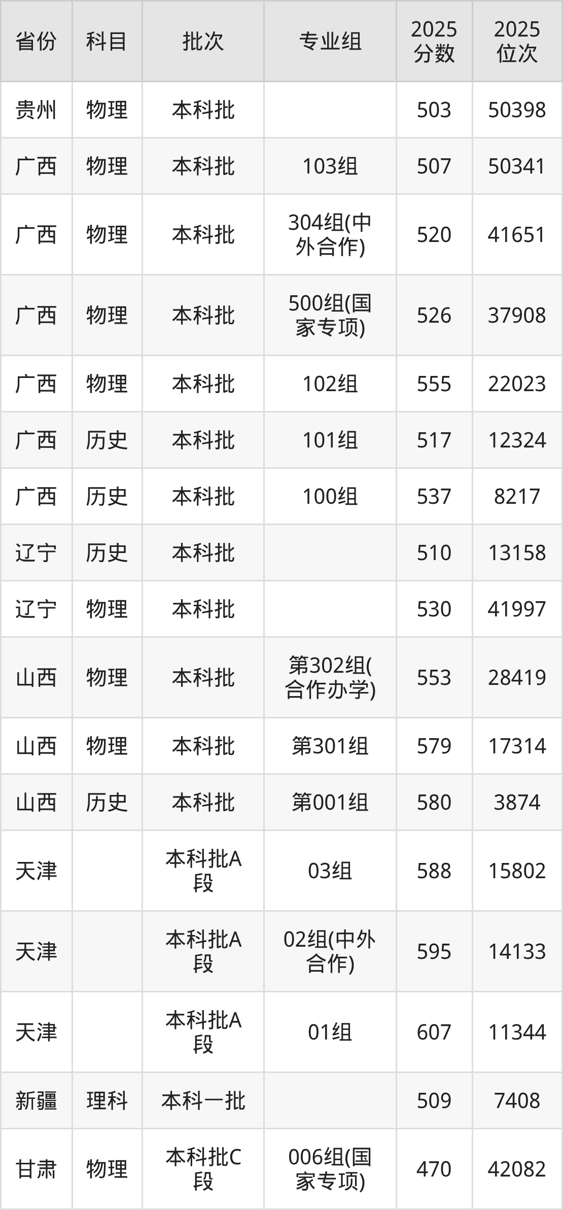 2025年在本科物理类进行招生,各专业组分数线详情如下: