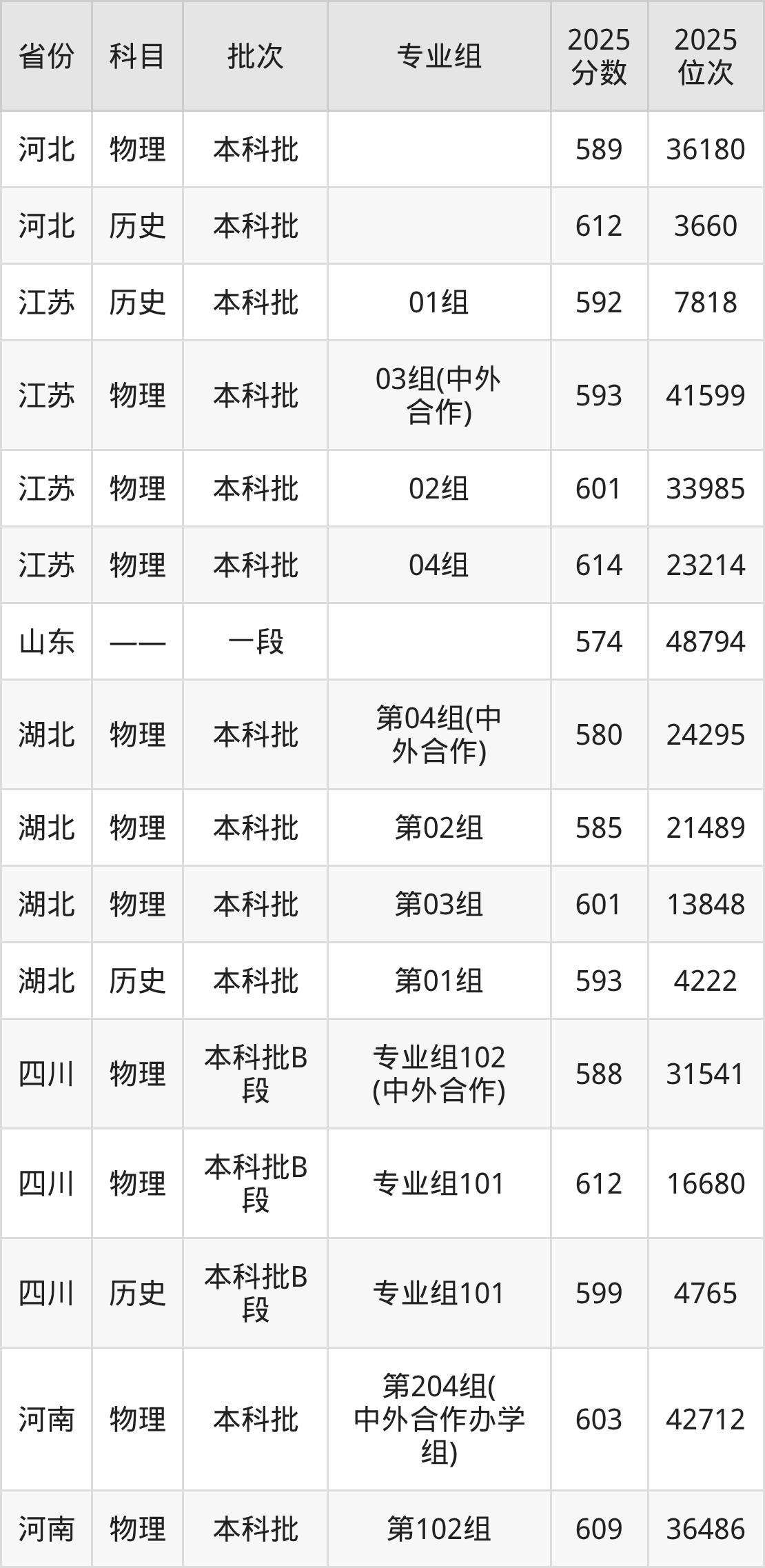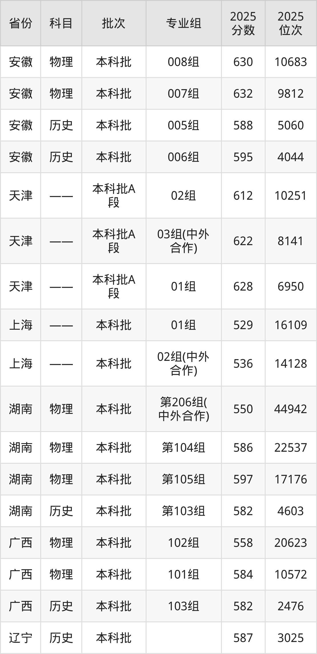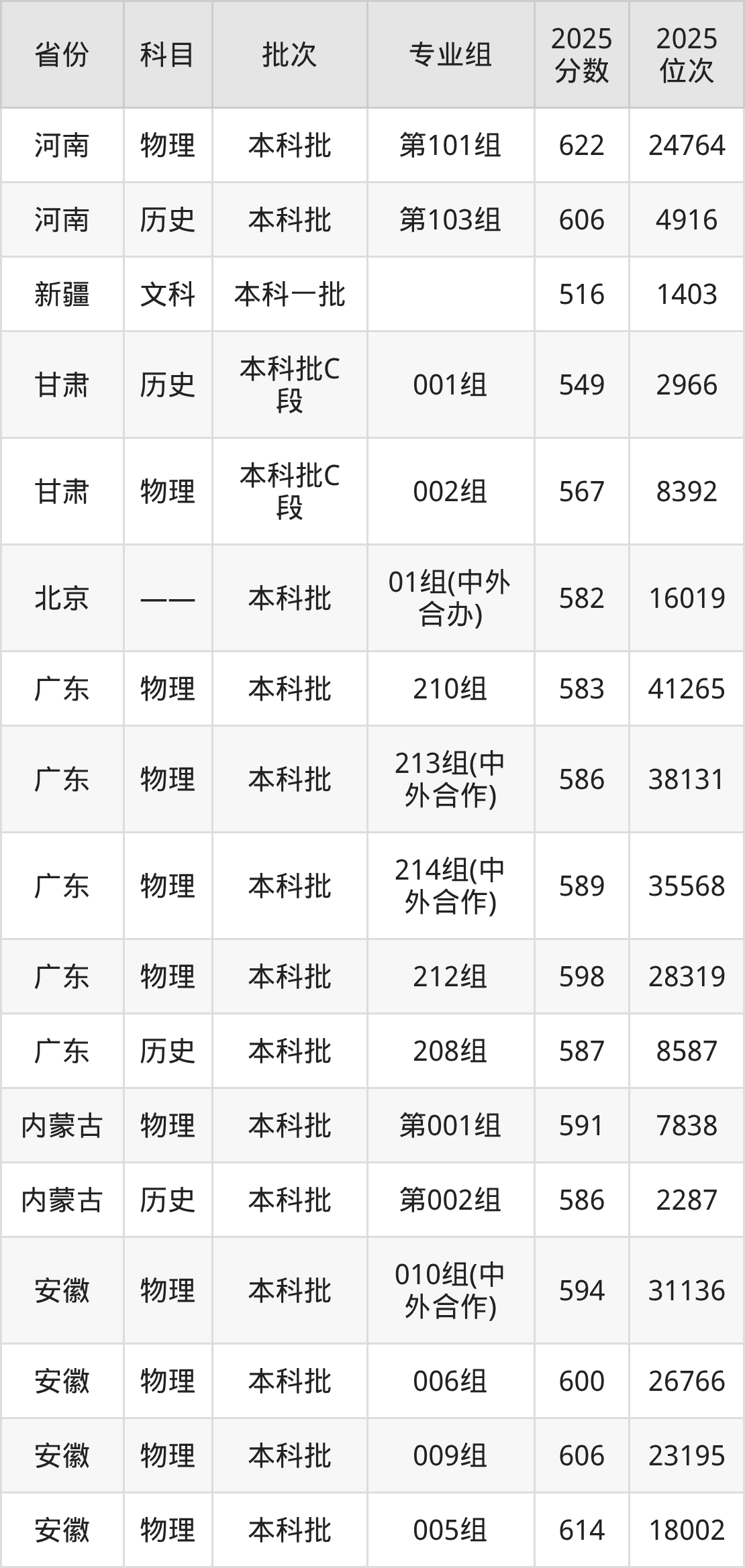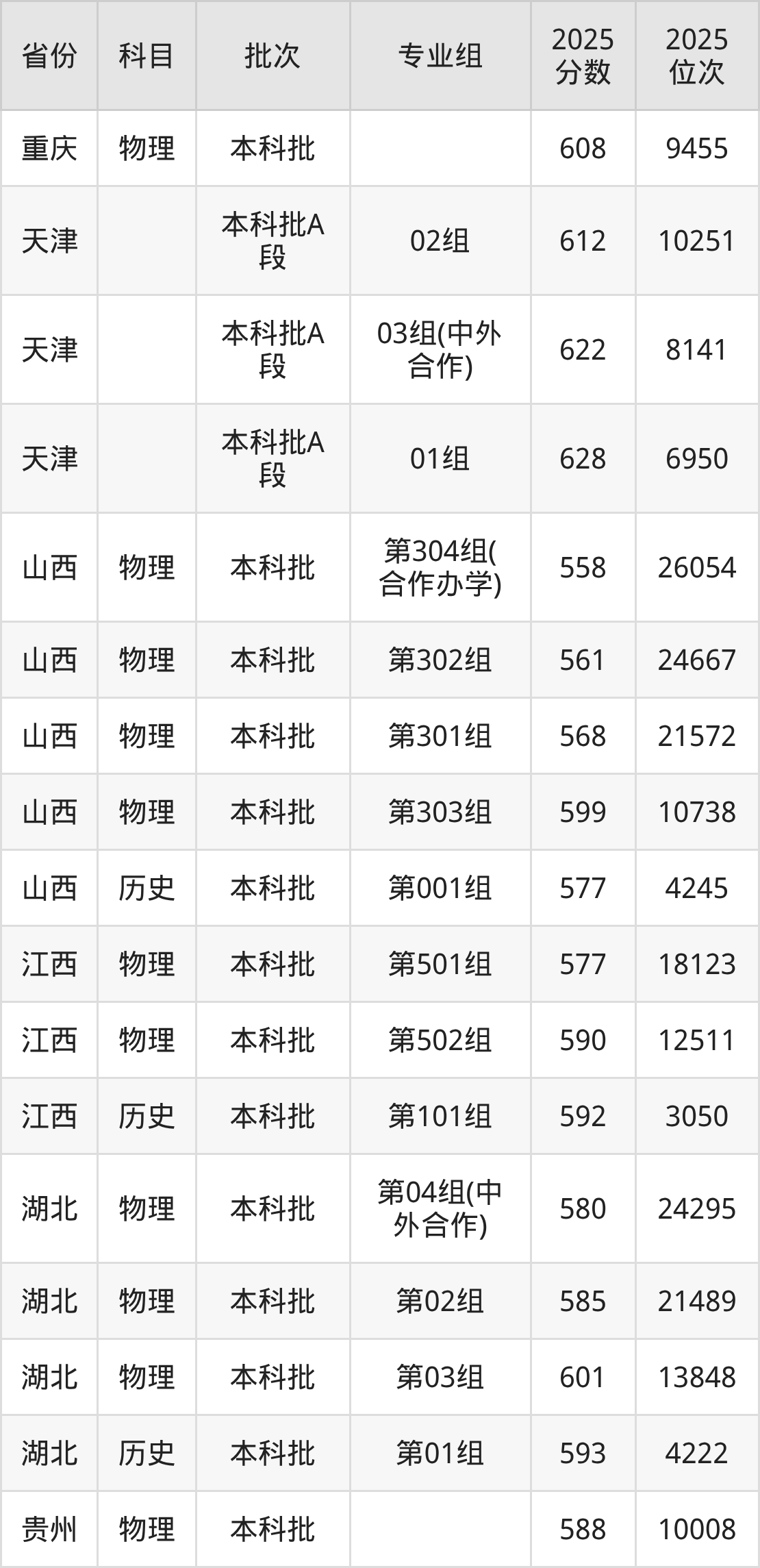安徽大学010组(中外合作办学):2025年投档录取最低分为594分,录取最低位次为31136名。