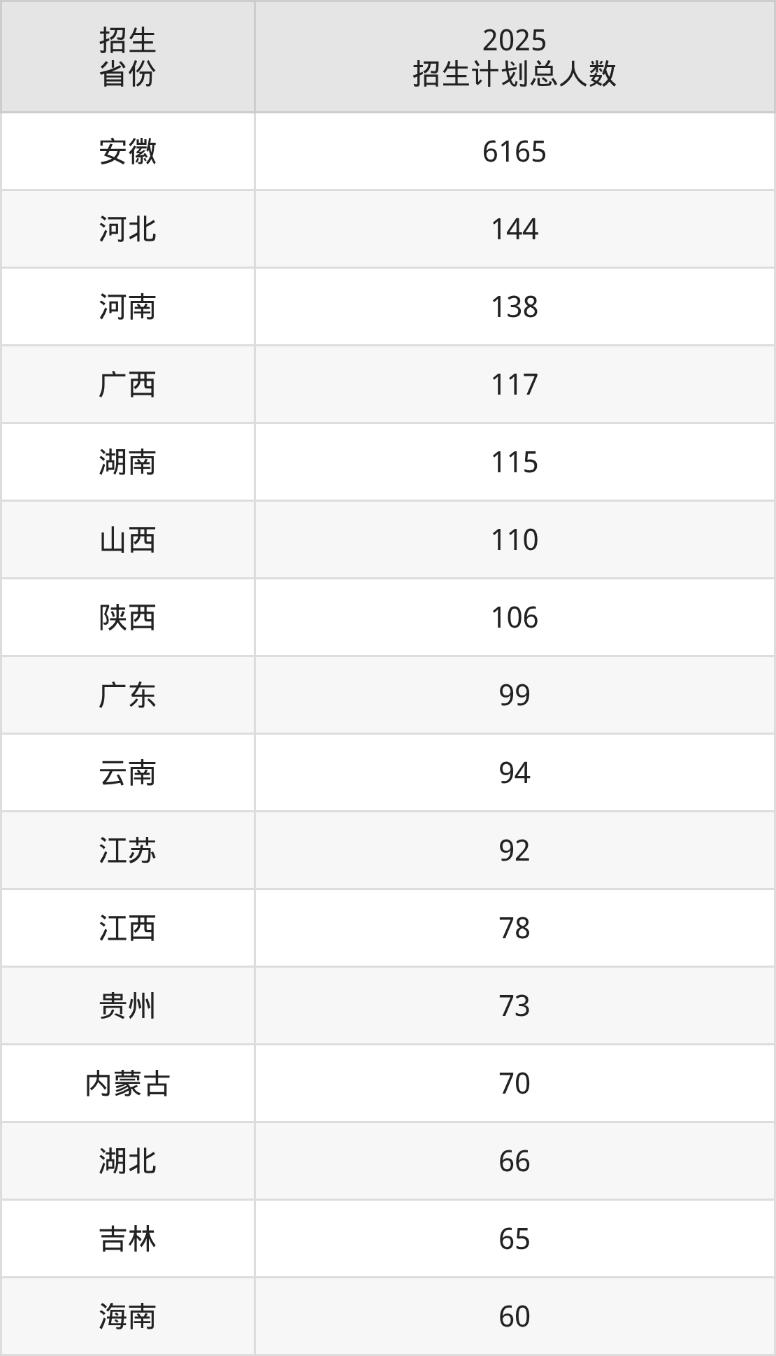 2025年安徽大学面向全国26个省市开展本科招生;招生专业共78个,招生人数共7934人。2025年在安徽省招生计划总人数是6165人,其中,安徽大学在安徽省招生人数最多的是材料类。安徽大学在各省具体招生人数情况如下表。