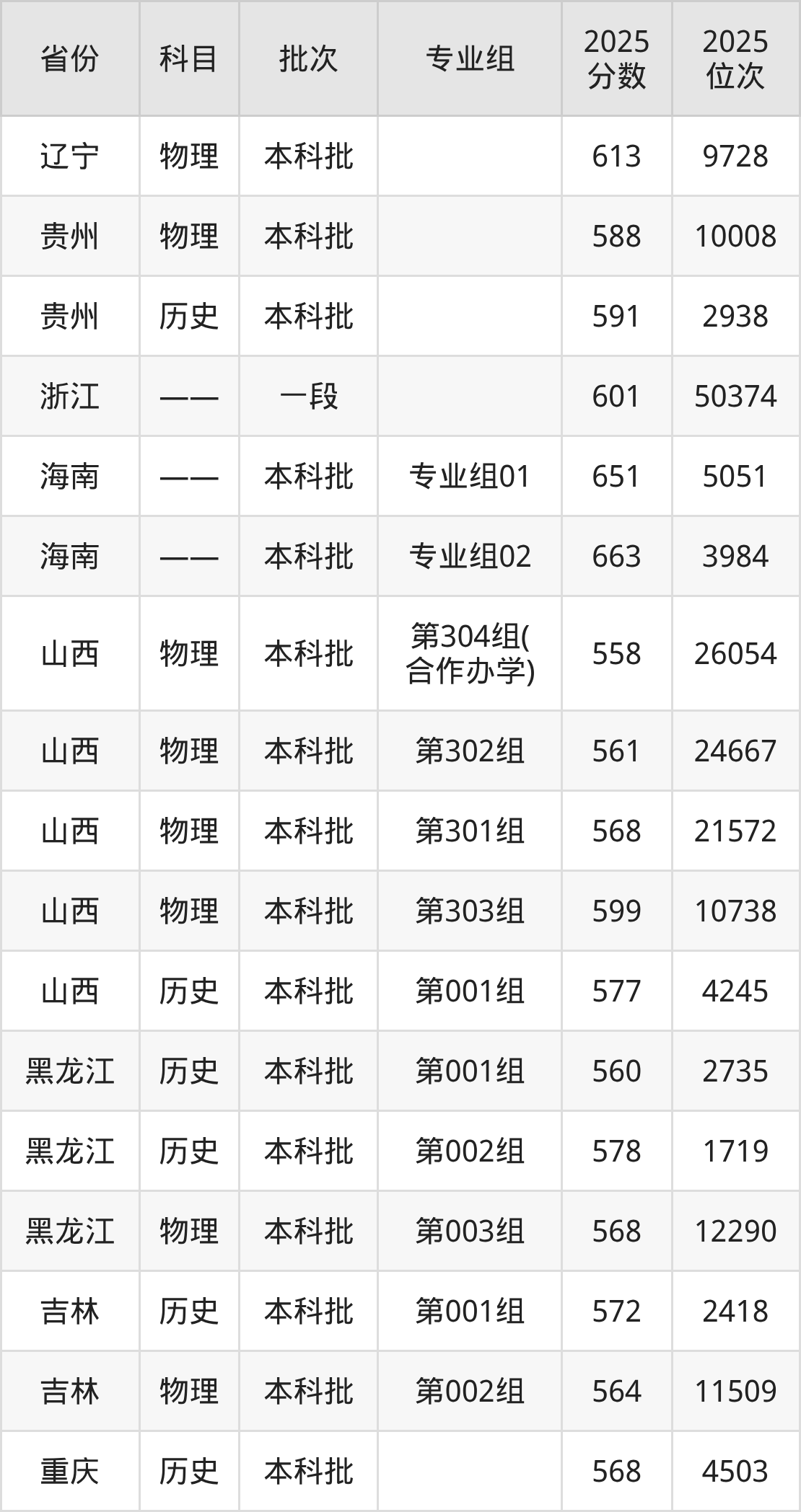 普通类本科物理类最低583分,本科历史类最低587分