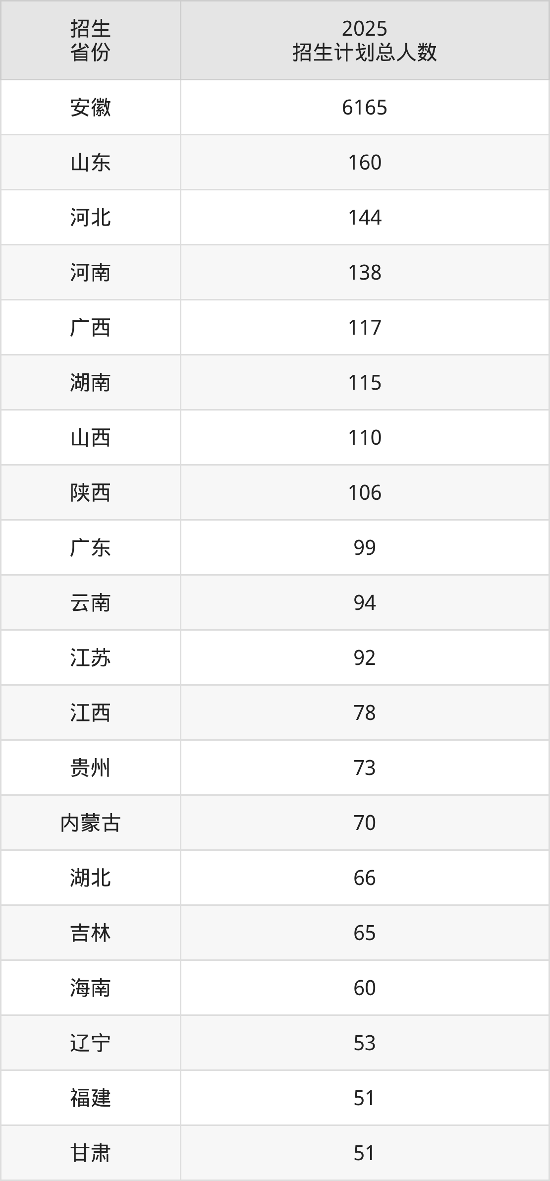 2025年安徽大学面向全国27个省市开展本科招生;招生专业共78个,招生人数共8094人。2025年在安徽省招生计划总人数是6165人,其中,安徽大学在安徽省招生人数最多的是材料类。安徽大学在各省具体招生人数情况如下表。