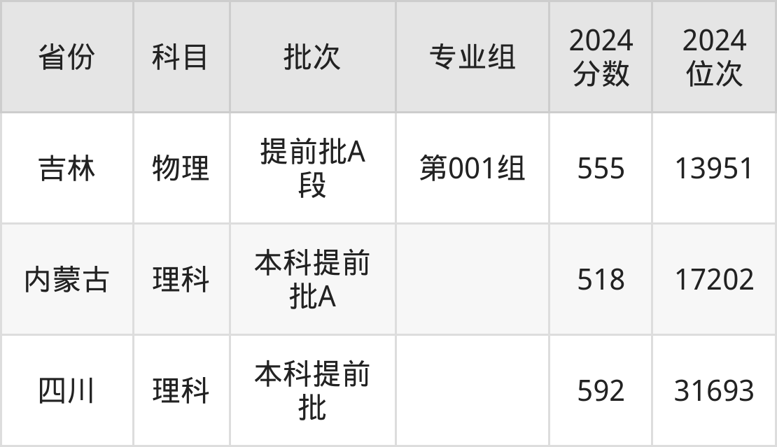 2024年在本科物理类进行招生,各专业组分数线详情如下: