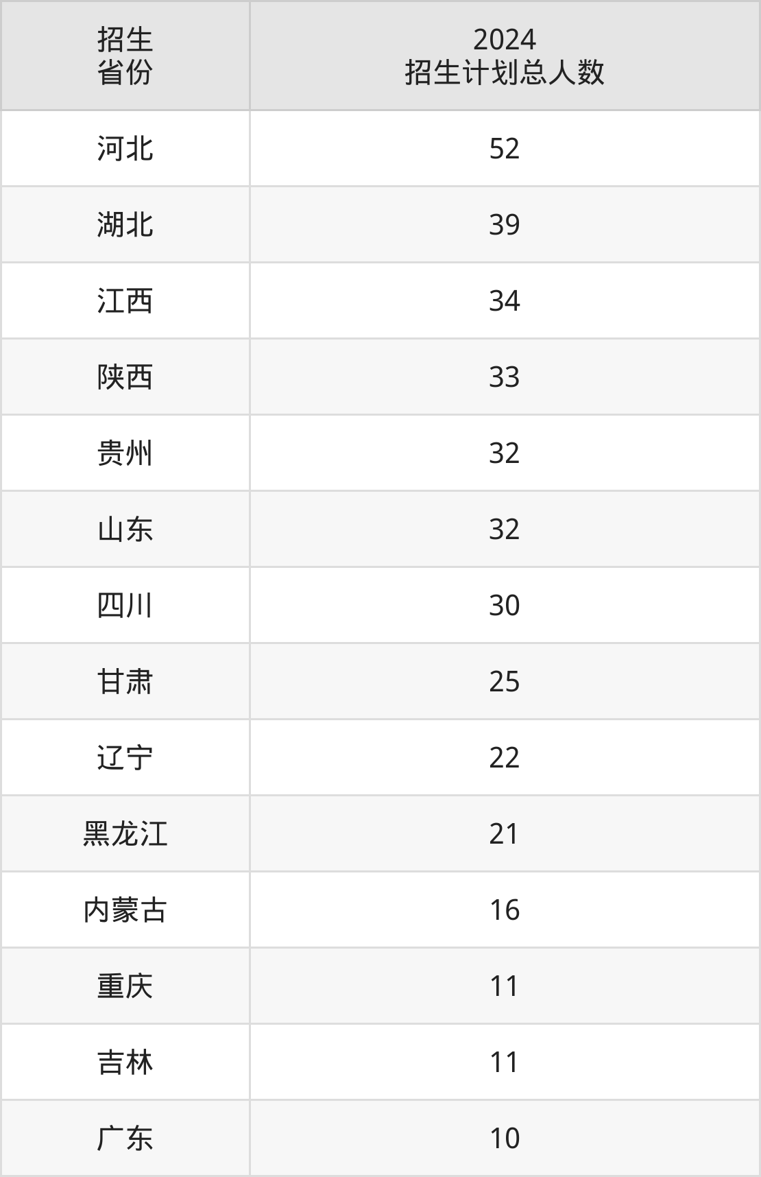 2024年陆军炮兵防空兵学院面向全国14个省市开展本科招生;招生专业共14个,招生人数共368人。陆军炮兵防空兵学院在各省具体招生人数情况如下表。