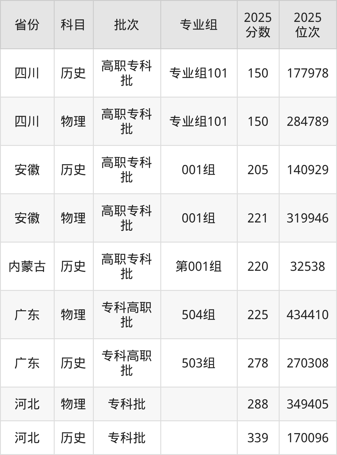 2025年在专科历史类进行招生,各专业组分数线详情如下: