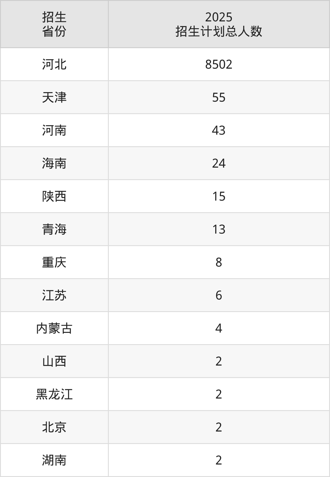2025年燕京理工学院面向全国13个省市开展本科招生;招生专业共42个,招生人数共6100人。2025年在河北省招生计划总人数是8502人,其中,燕京理工学院在河北省招生人数最多的是会计学。燕京理工学院在各省具体招生人数情况如下表。