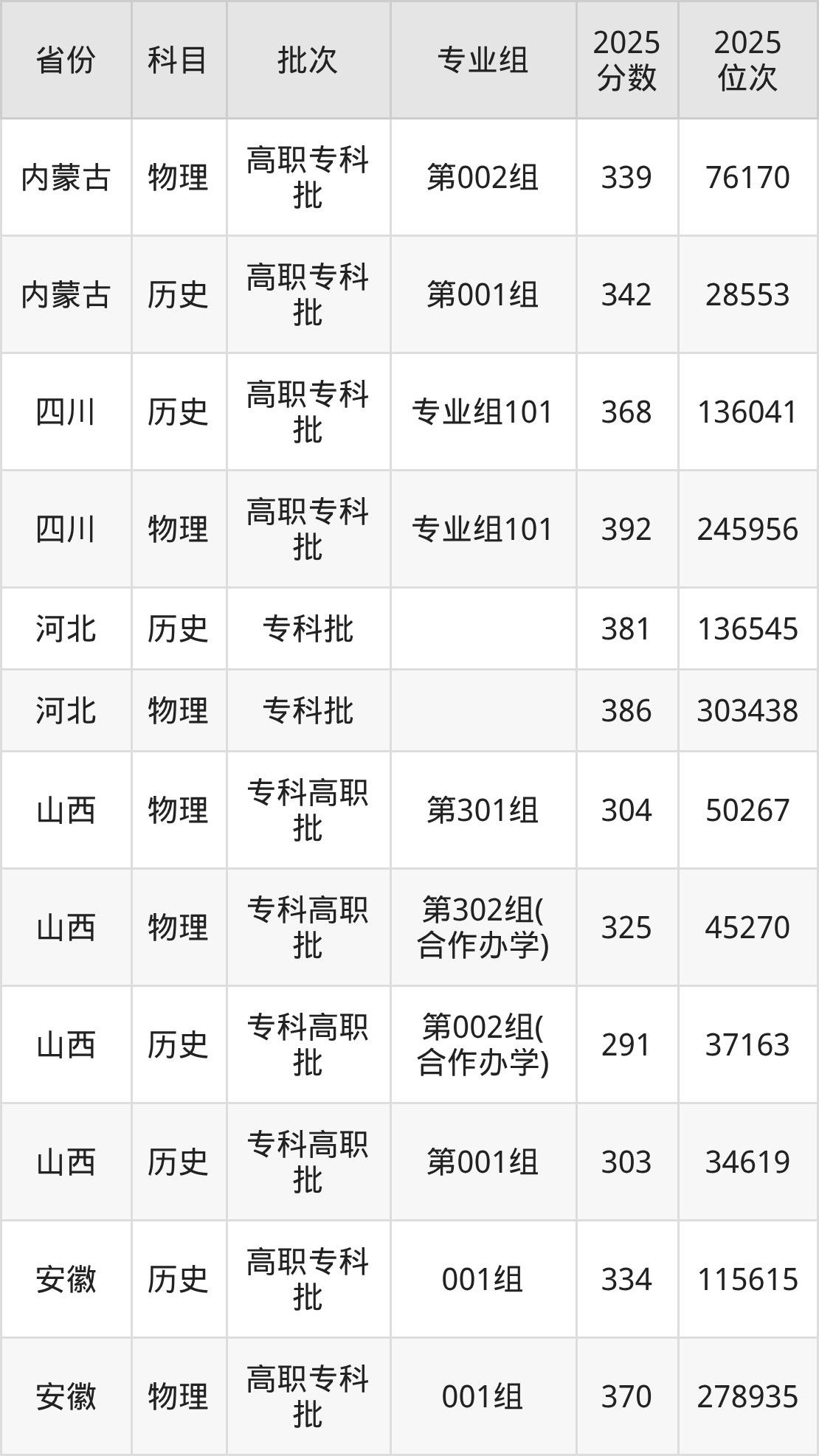 2025年东营科技职业学院全国录取分数线是291分到456分,录取最低在山西历史类(第002组(合作办学))、录取最高在河北历史类。各省各专业组最低分具有差异,详情如下: