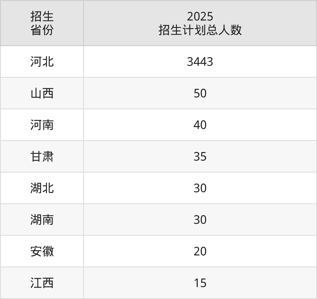 2025年石家庄学院面向全国8个省市开展本科招生;招生专业共46个,招生人数共3663人。2025年在河北省招生计划总人数是3443人,其中,石家庄学院在河北省招生人数最多的是人工智能。石家庄学院在各省具体招生人数情况如下表。
