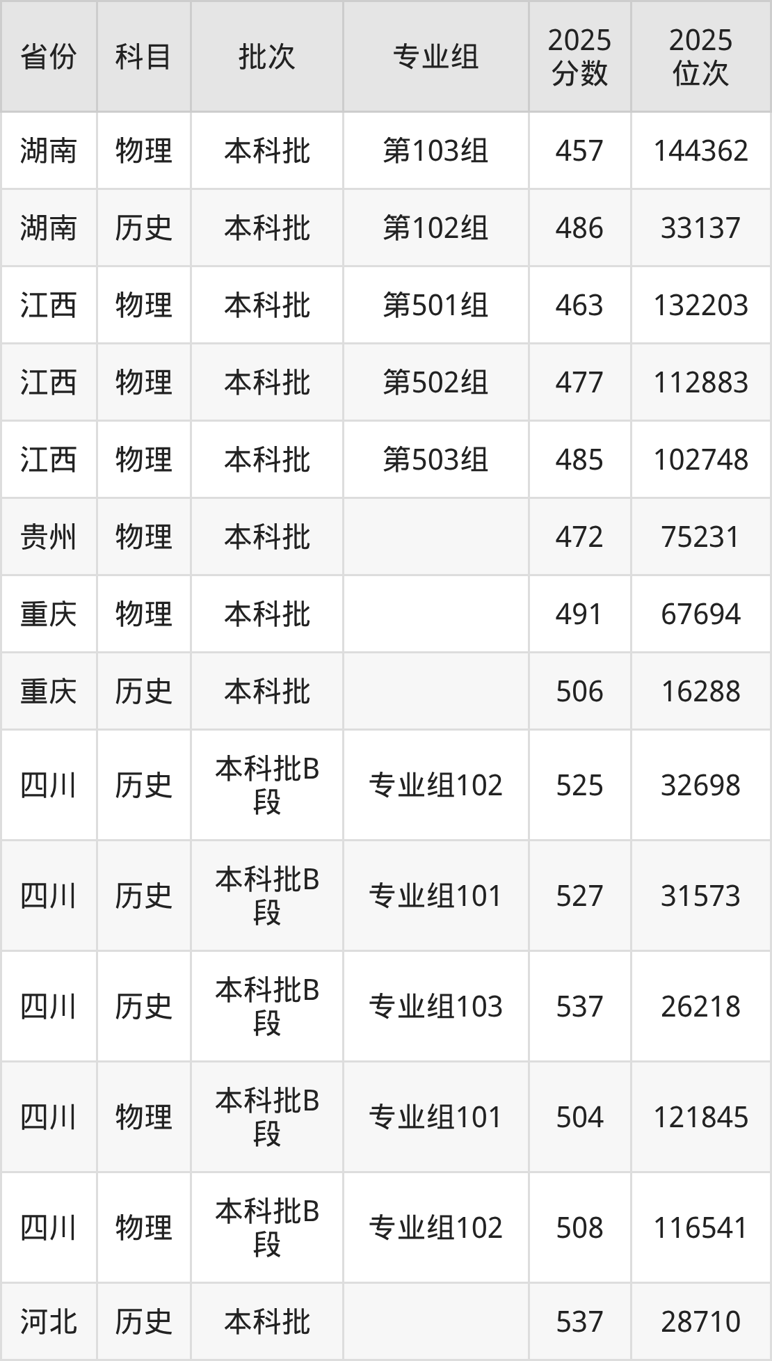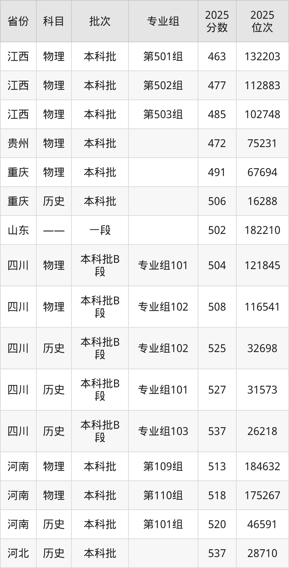 2025年在本科物理类进行招生,各专业组分数线详情如下: