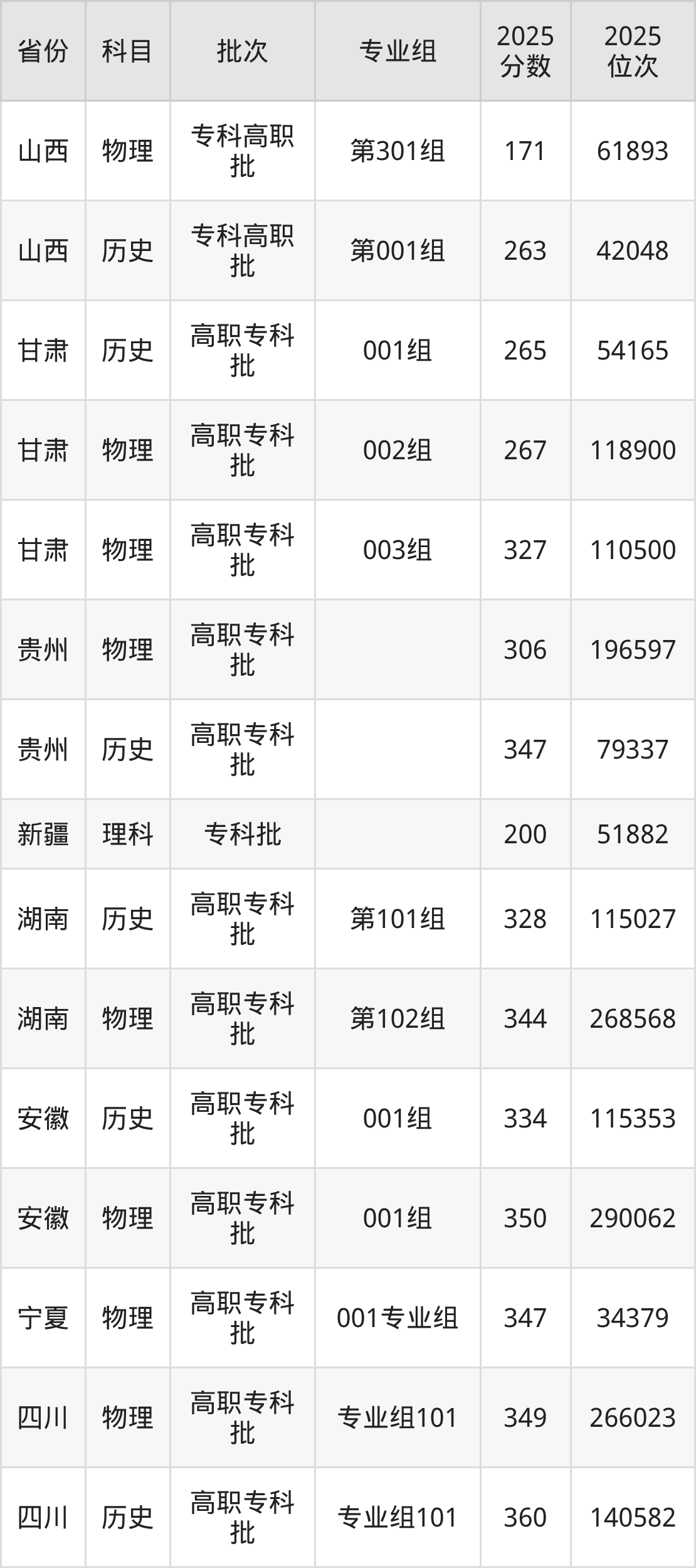 2025年在专科物理类进行招生,各专业组分数线详情如下: