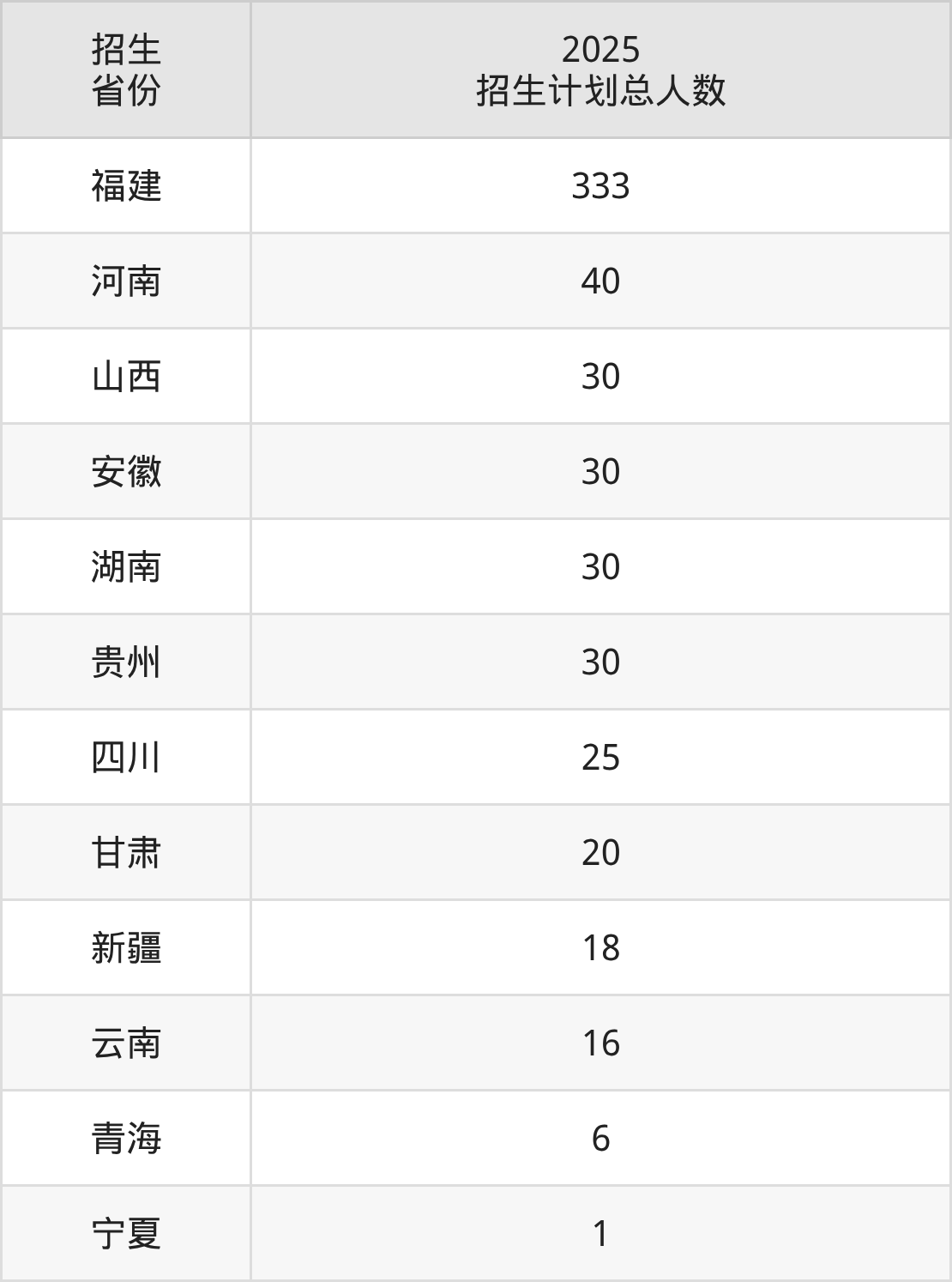 2025年宁德职业技术学院面向全国12个省市开展专科招生;招生专业共20个,招生人数共579人。2025年在福建省招生计划总人数是333人,其中,宁德职业技术学院在福建省招生人数最多的是婴幼儿托育服务与管理。宁德职业技术学院在各省具体招生人数情况如下表。