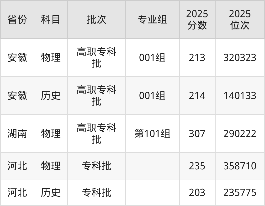 2025年在专科物理类进行招生,各专业组分数线详情如下: