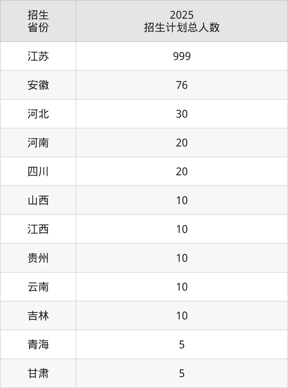 2025年江苏城乡建设职业学院面向全国12个省市开展专科招生;招生专业共37个,招生人数共1205人。2025年在江苏省招生计划总人数是999人,其中,江苏城乡建设职业学院在江苏省招生人数最多的是环境工程技术。江苏城乡建设职业学院在各省具体招生人数情况如下表。