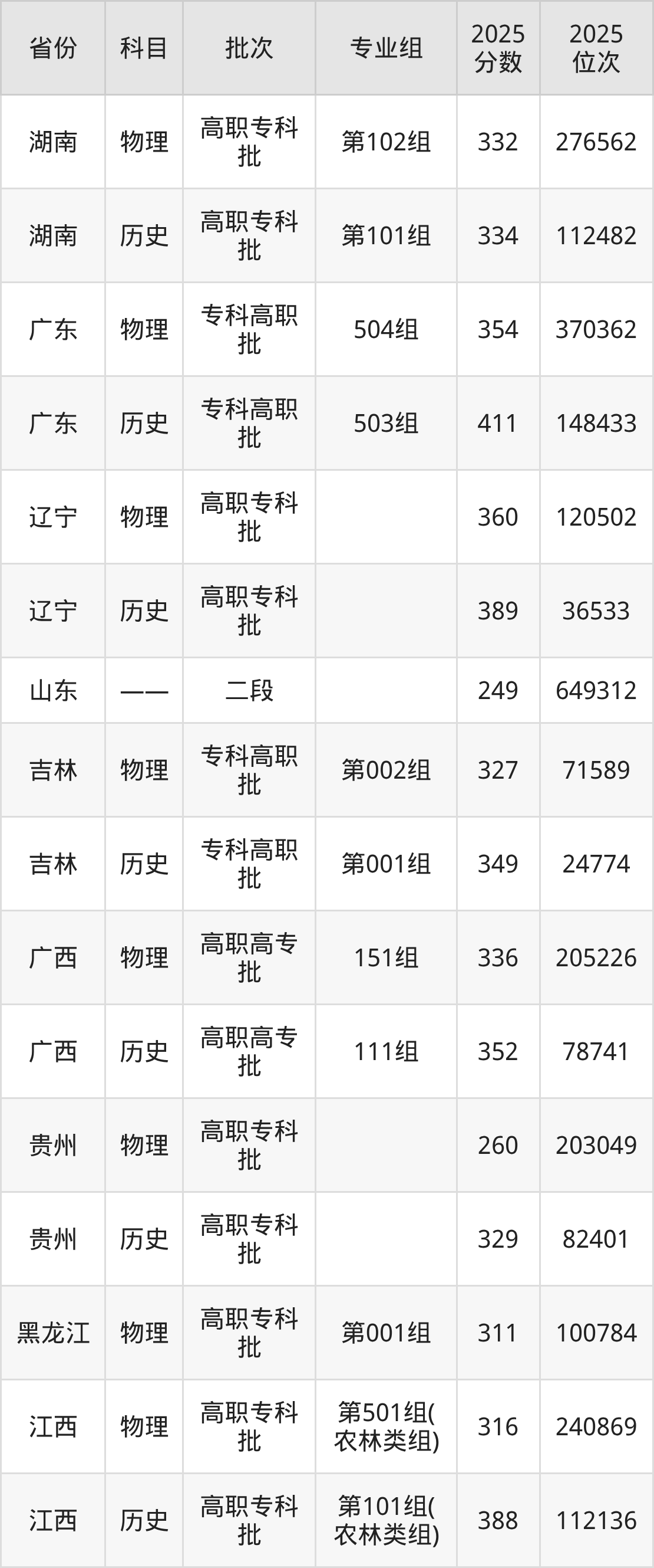 普通类专科物理类最低332分,专科历史类最低334分