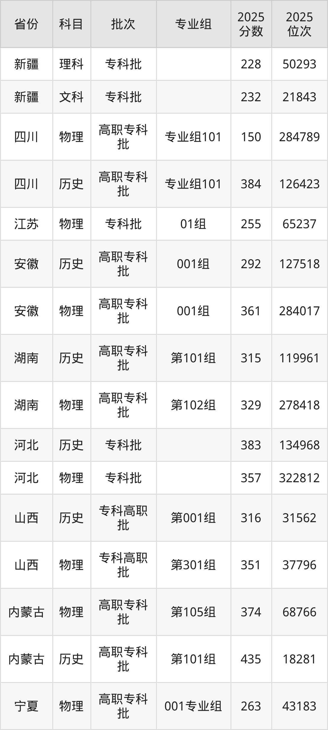 2025年在专科物理类进行招生,各专业组分数线详情如下: