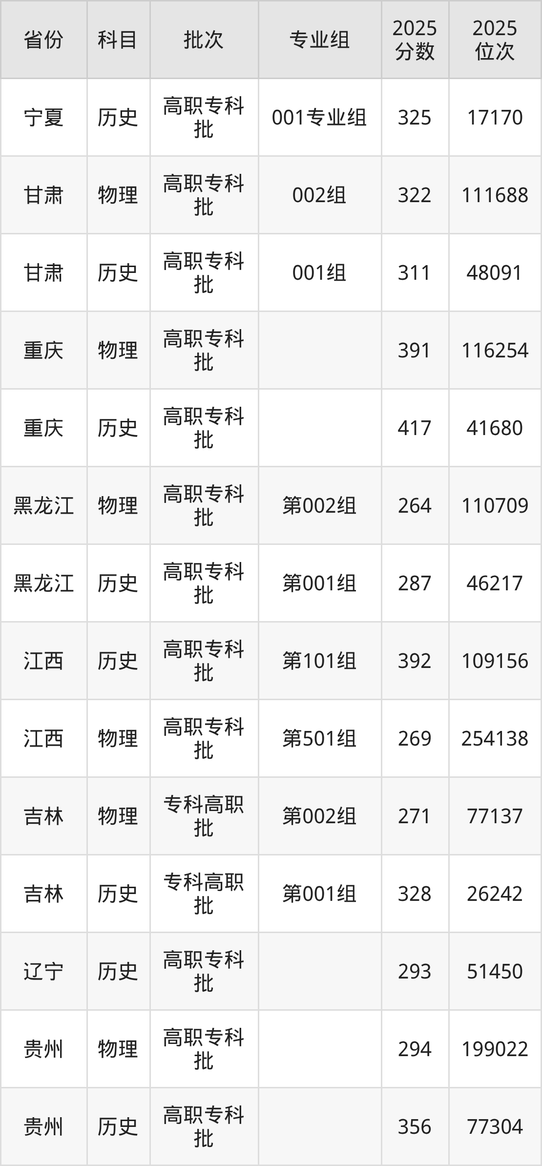 普通类专科物理类最低269分,专科历史类最低392分