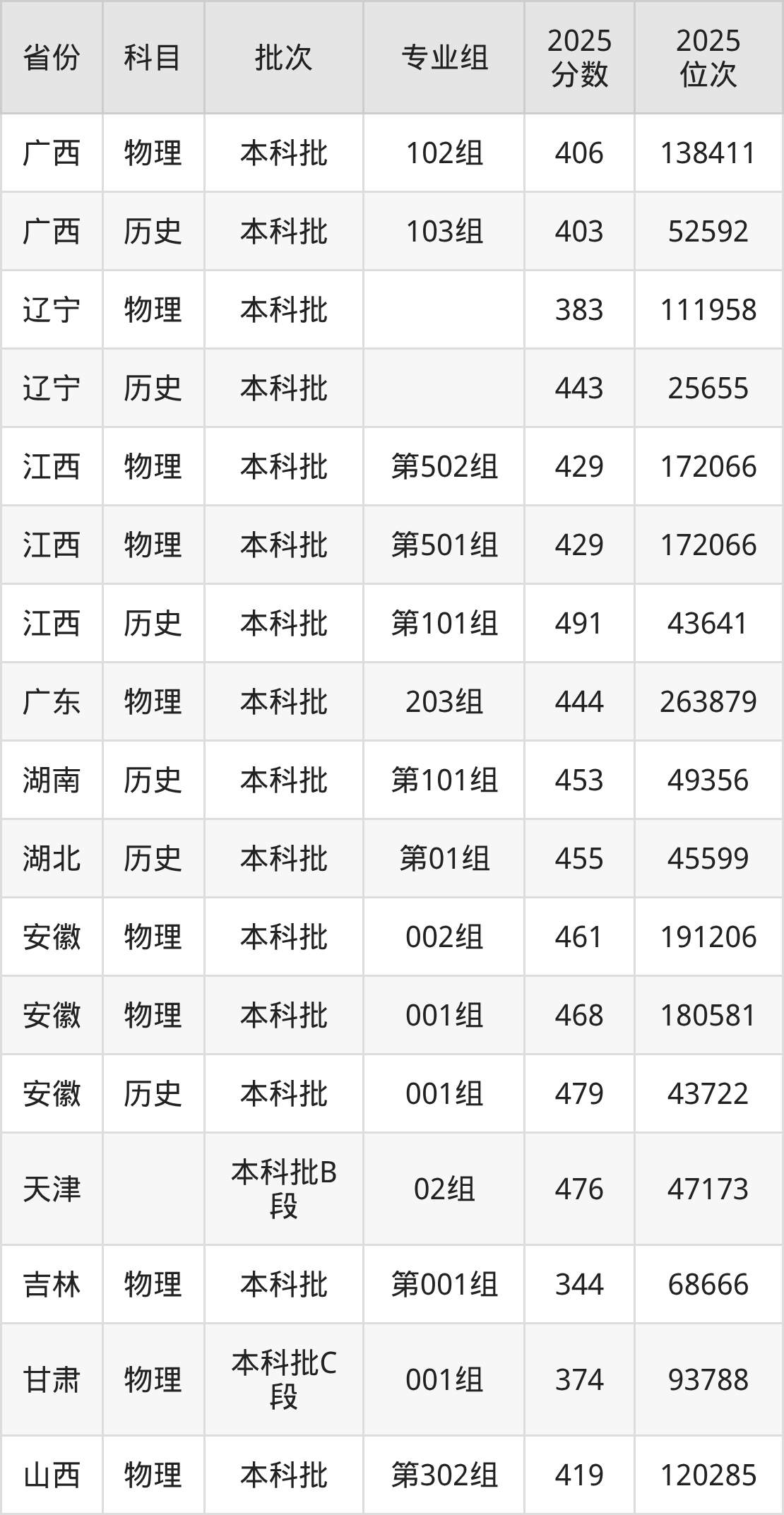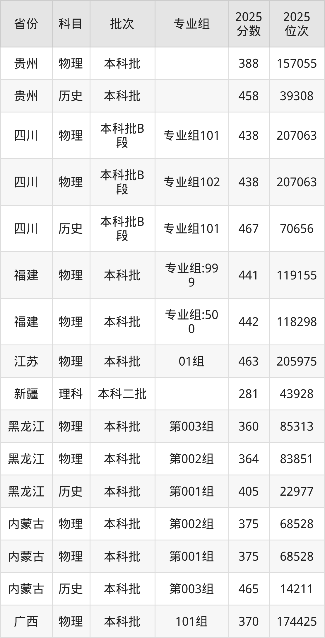 2025年在本科物理类进行招生,各专业组分数线详情如下: