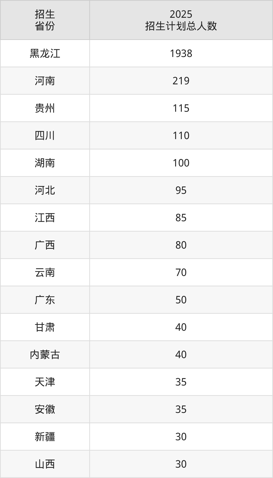 2025年黑龙江东方学院面向全国22个省市开展本科招生;招生专业共39个,招生人数共3177人。2025年在黑龙江省招生计划总人数是1938人,其中,黑龙江东方学院在黑龙江省招生人数最多的是机械设计制造及其自动化。黑龙江东方学院在各省具体招生人数情况如下表。