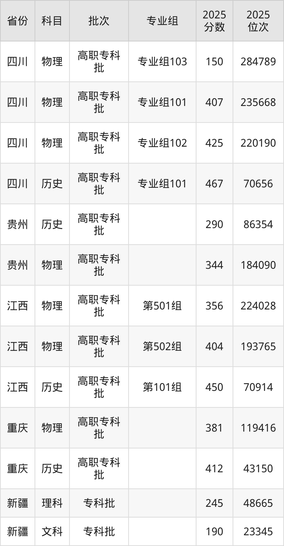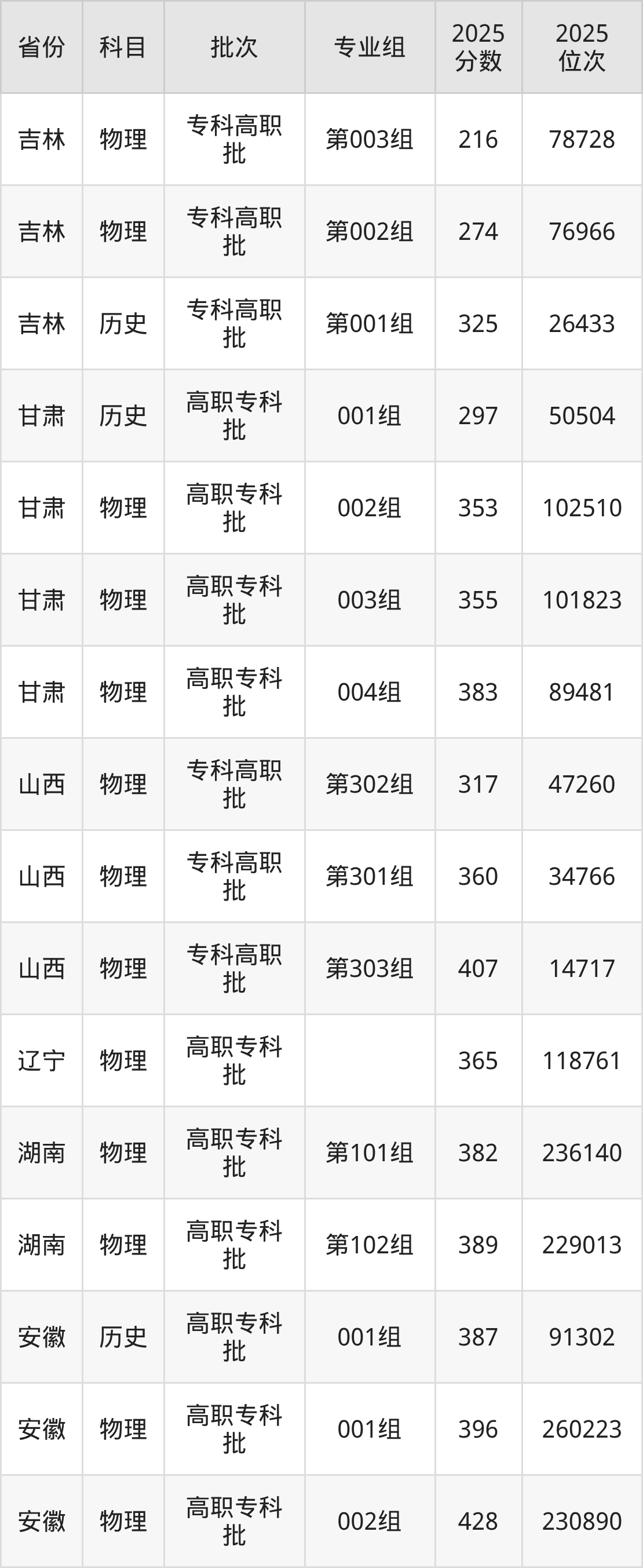2025年在专科物理类进行招生,各专业组分数线详情如下: