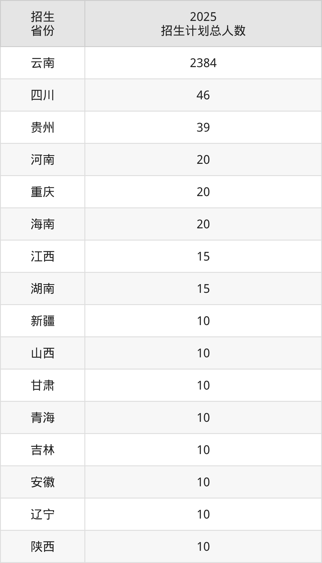 2025年昆明冶金高等专科学校面向全国16个省市开展专科招生;招生专业共55个,招生人数共2639人。2025年在云南省招生计划总人数是2384人,其中,昆明冶金高等专科学校在云南省招生人数最多的是机电一体化技术。昆明冶金高等专科学校在各省具体招生人数情况如下表。
