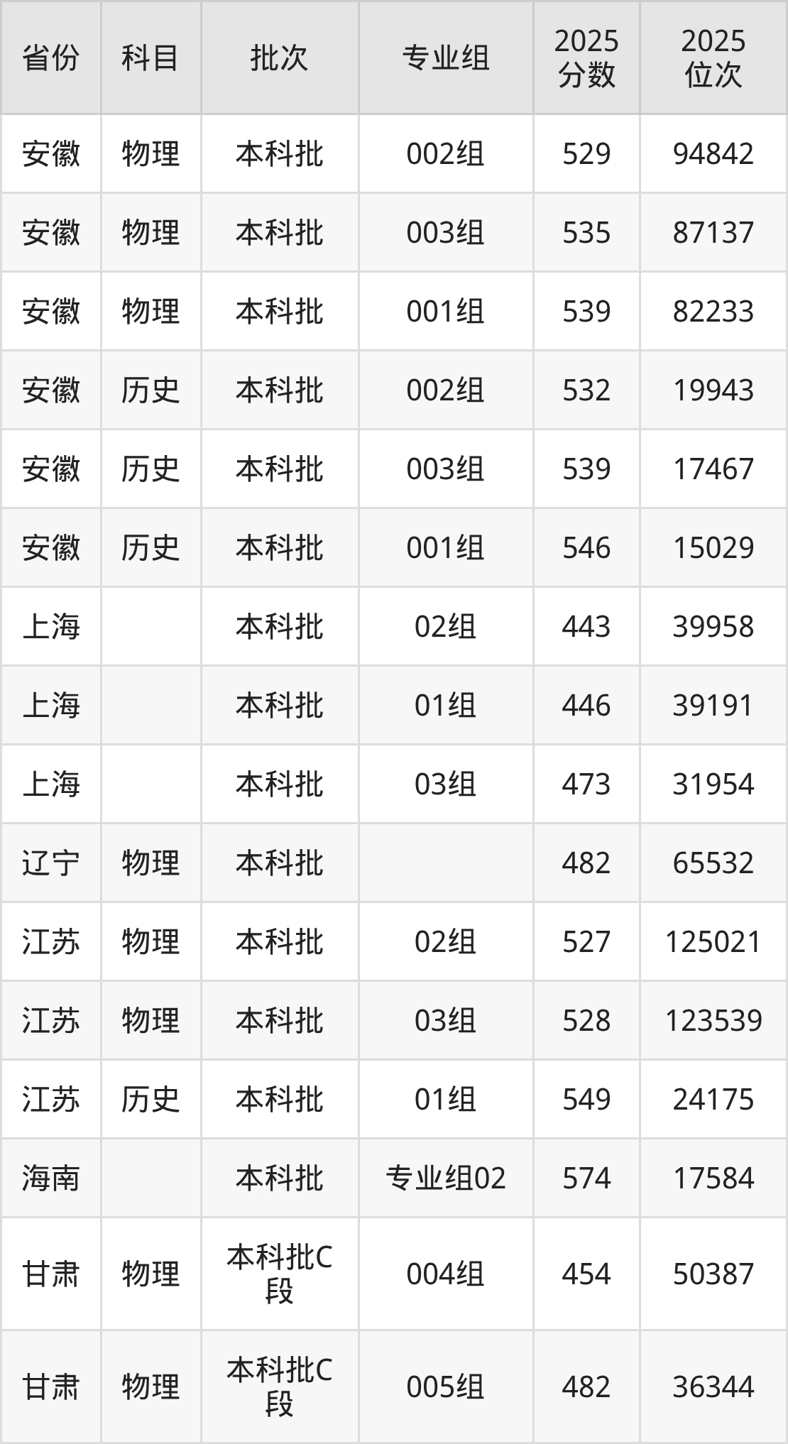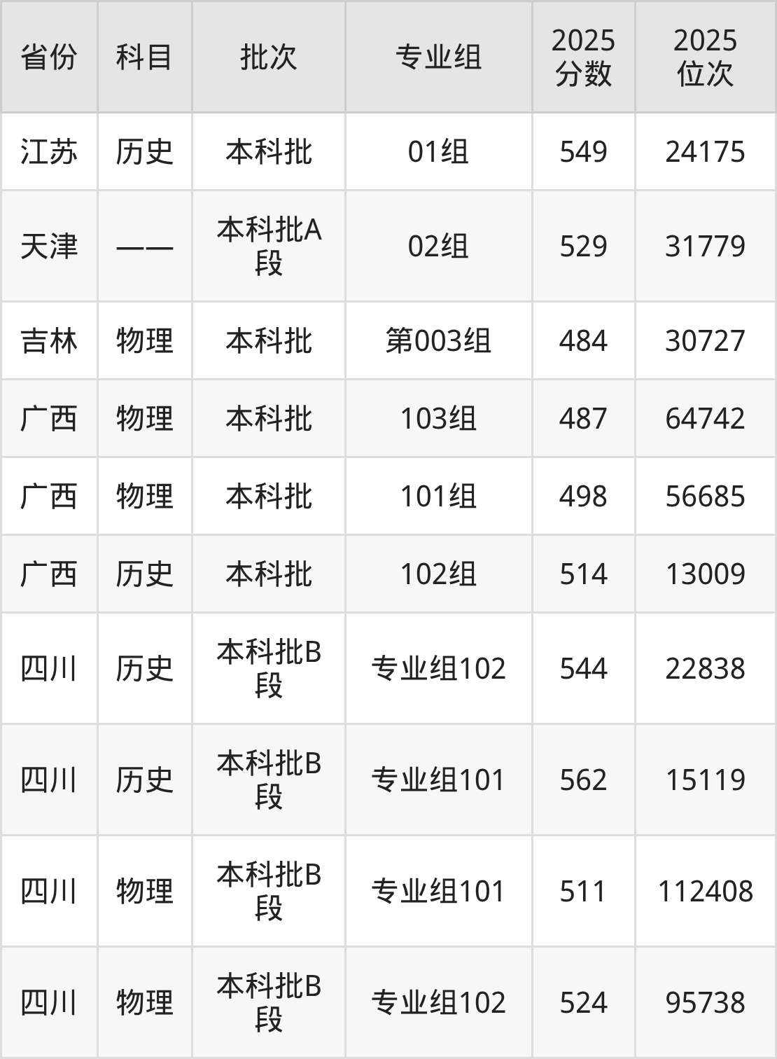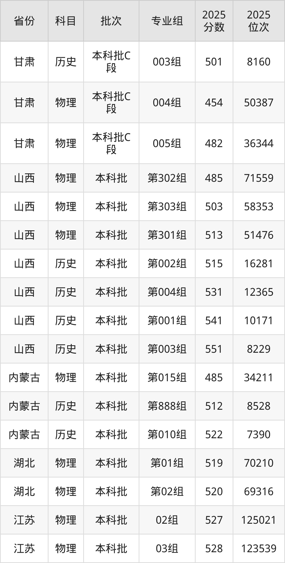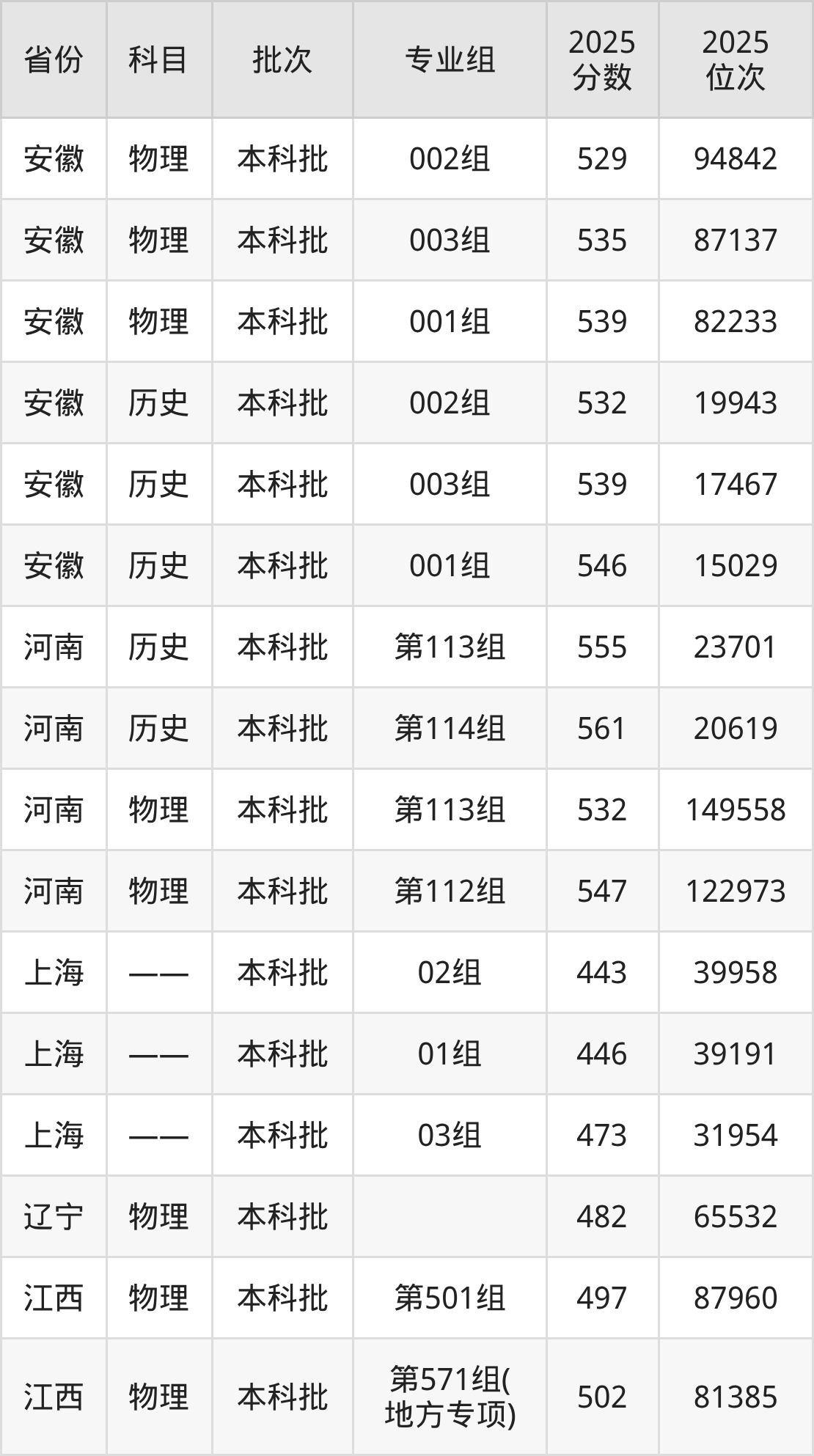 2025年在本科物理类进行招生,各专业组分数线详情如下: