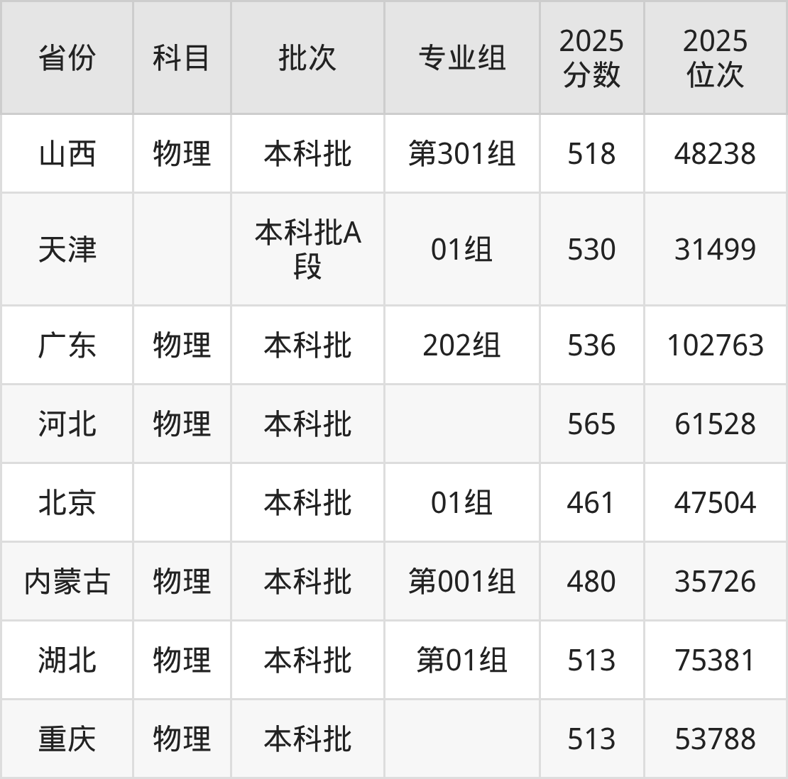 2025年在本科物理类进行招生,各专业组分数线详情如下: