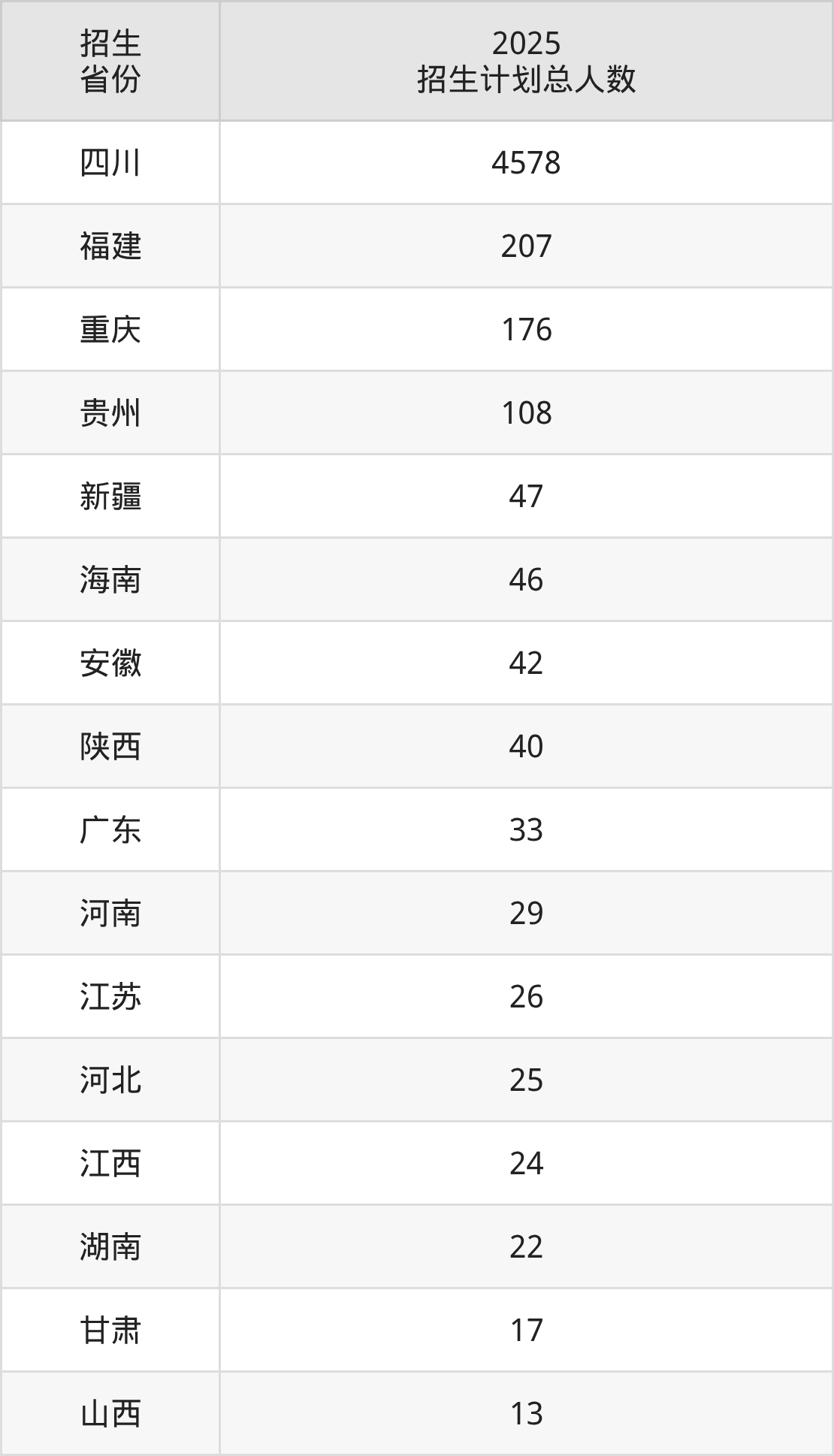 2025年四川大学锦江学院面向全国27个省市开展本科招生;招生专业共32个,招生人数共4981人。2025年在四川省招生计划总人数是4578人,其中,四川大学锦江学院在四川省招生人数最多的是会计学。四川大学锦江学院在各省具体招生人数情况如下表。