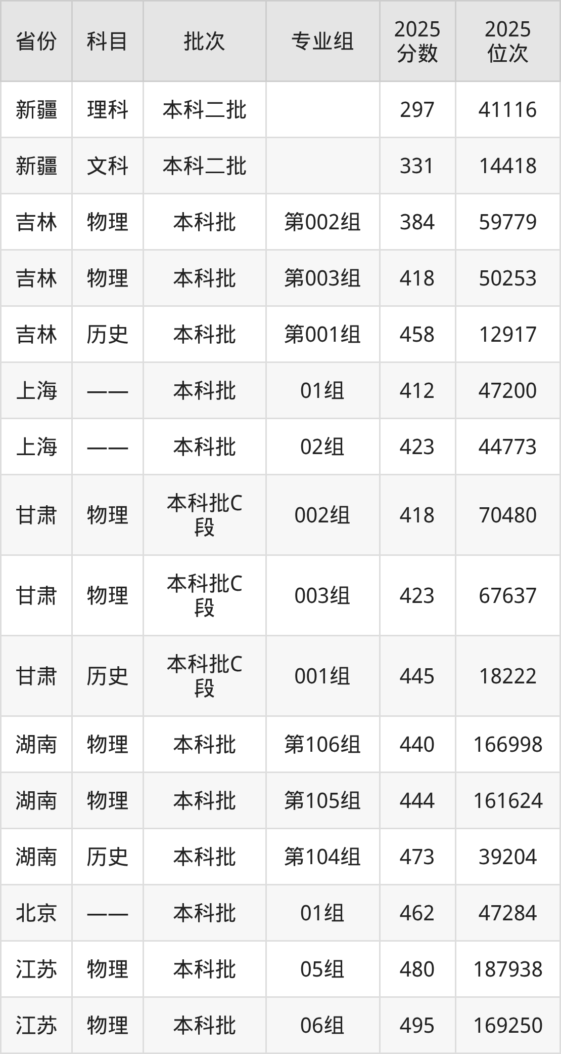 2025年投档录取最低分为297分,录取最低位次为41116名。