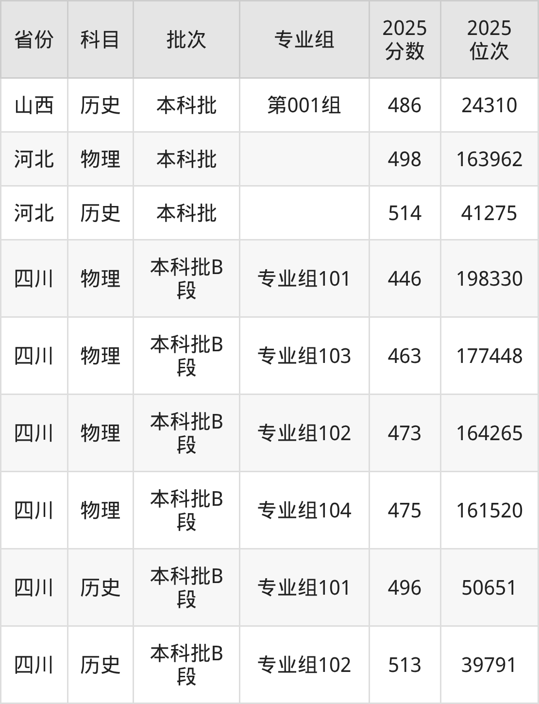 四川大学锦江学院第002组:2025年投档录取最低分为384分,录取最低位次为59779名。