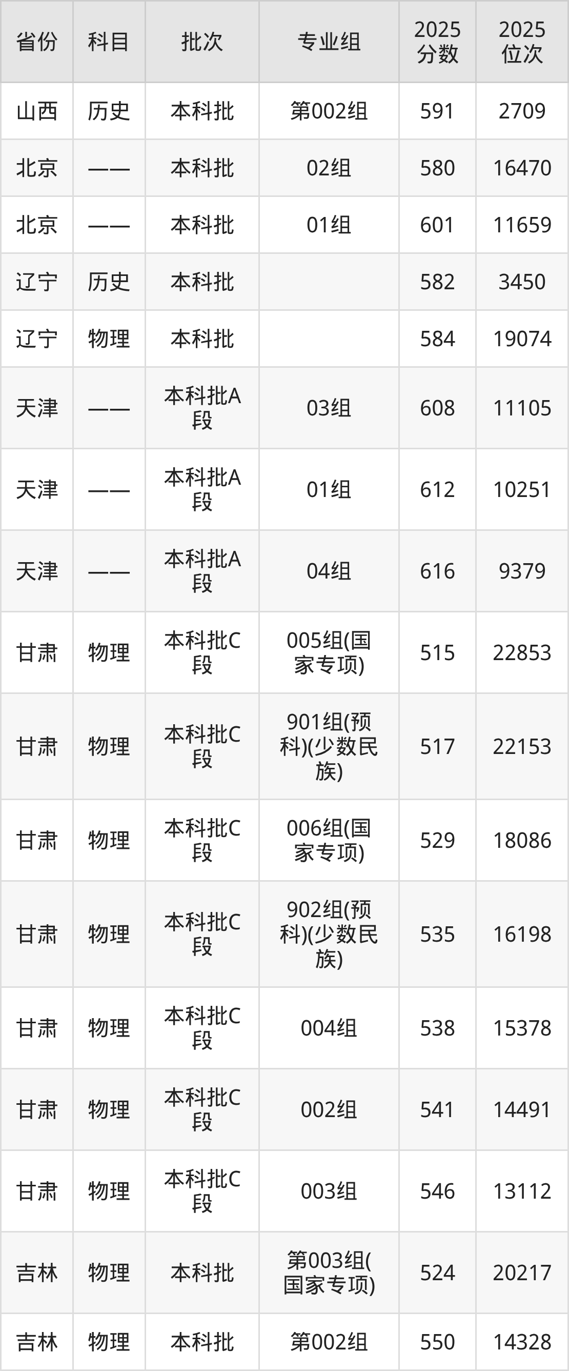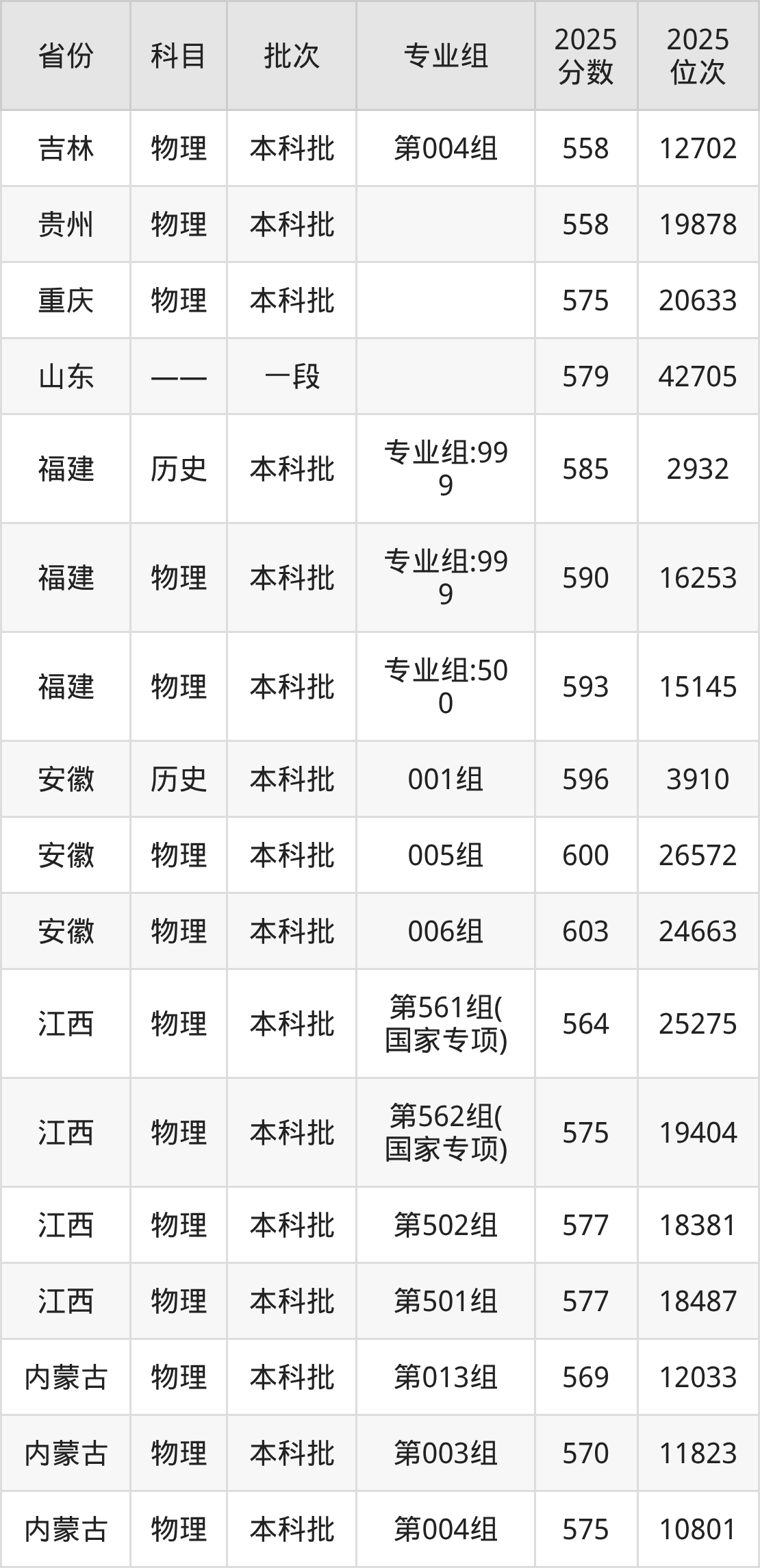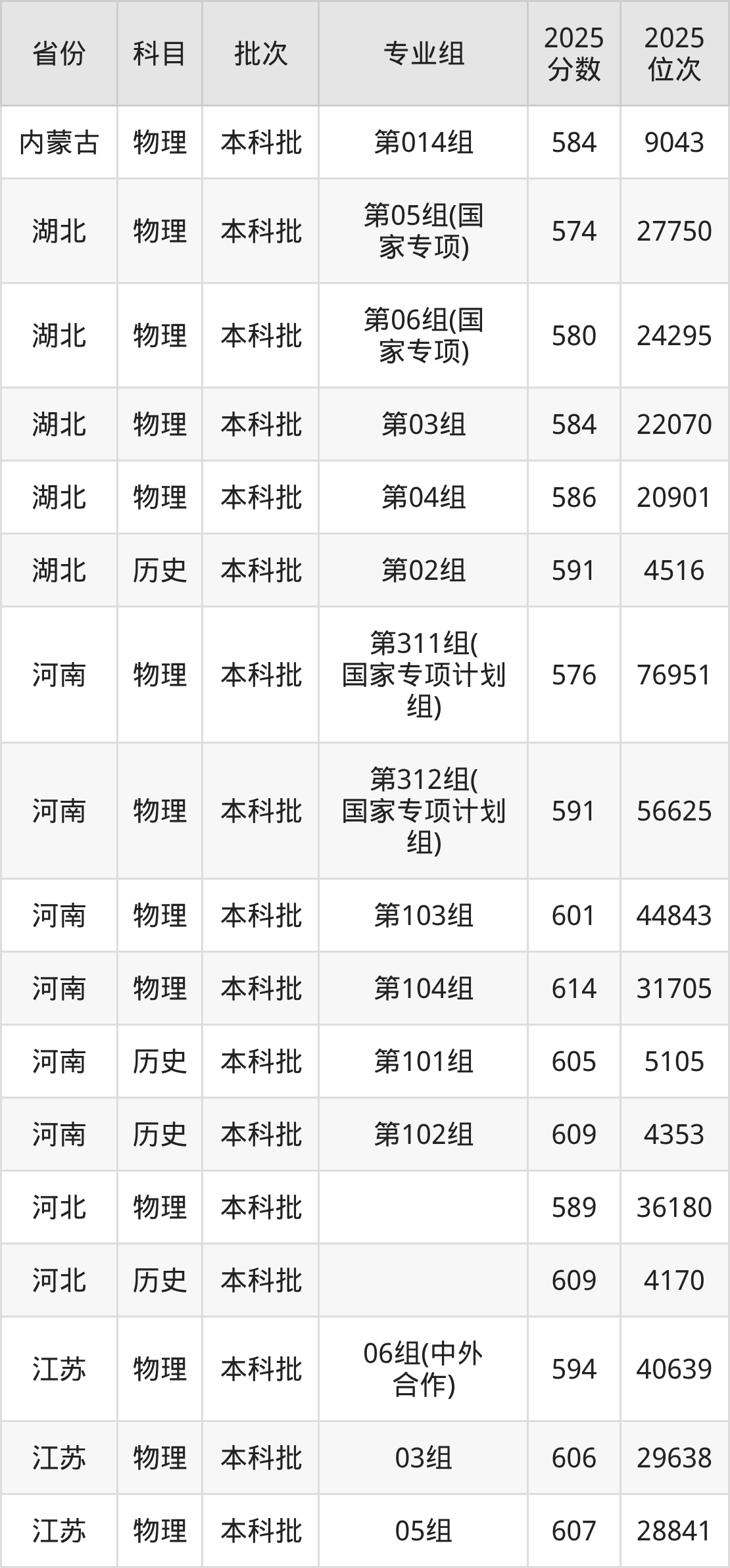 2025年在本科物理类进行招生,各专业组分数线详情如下: