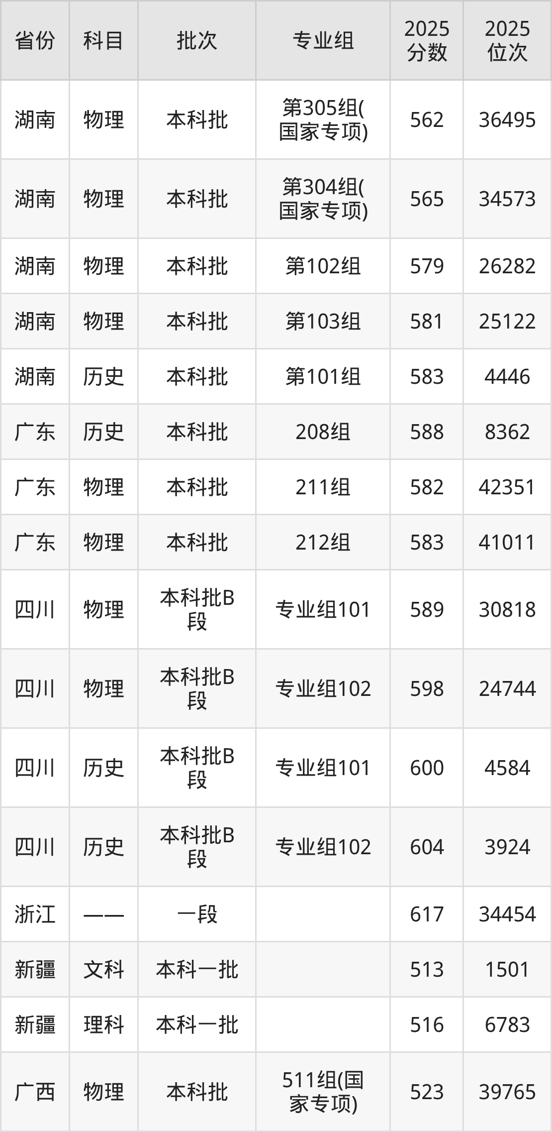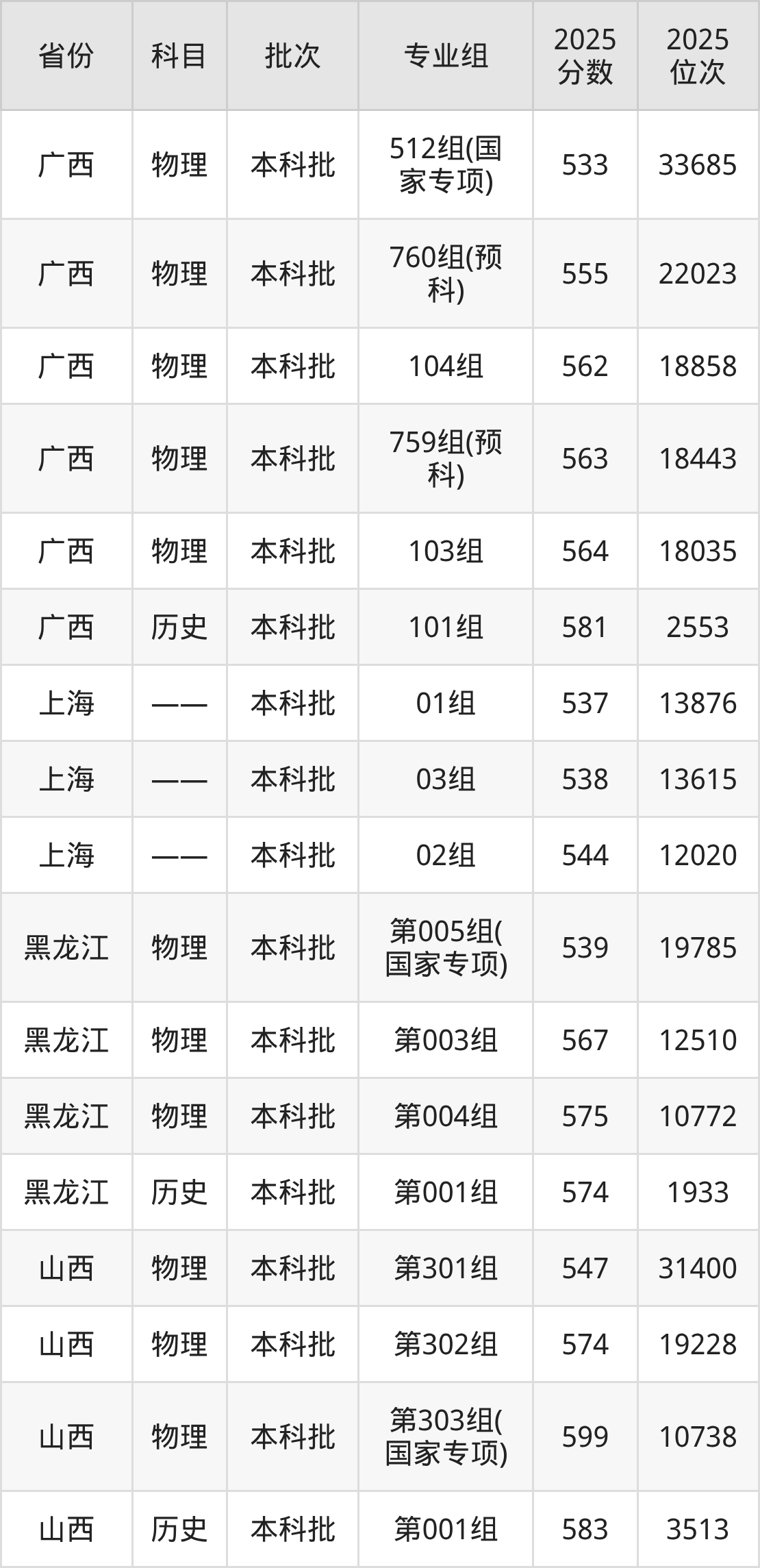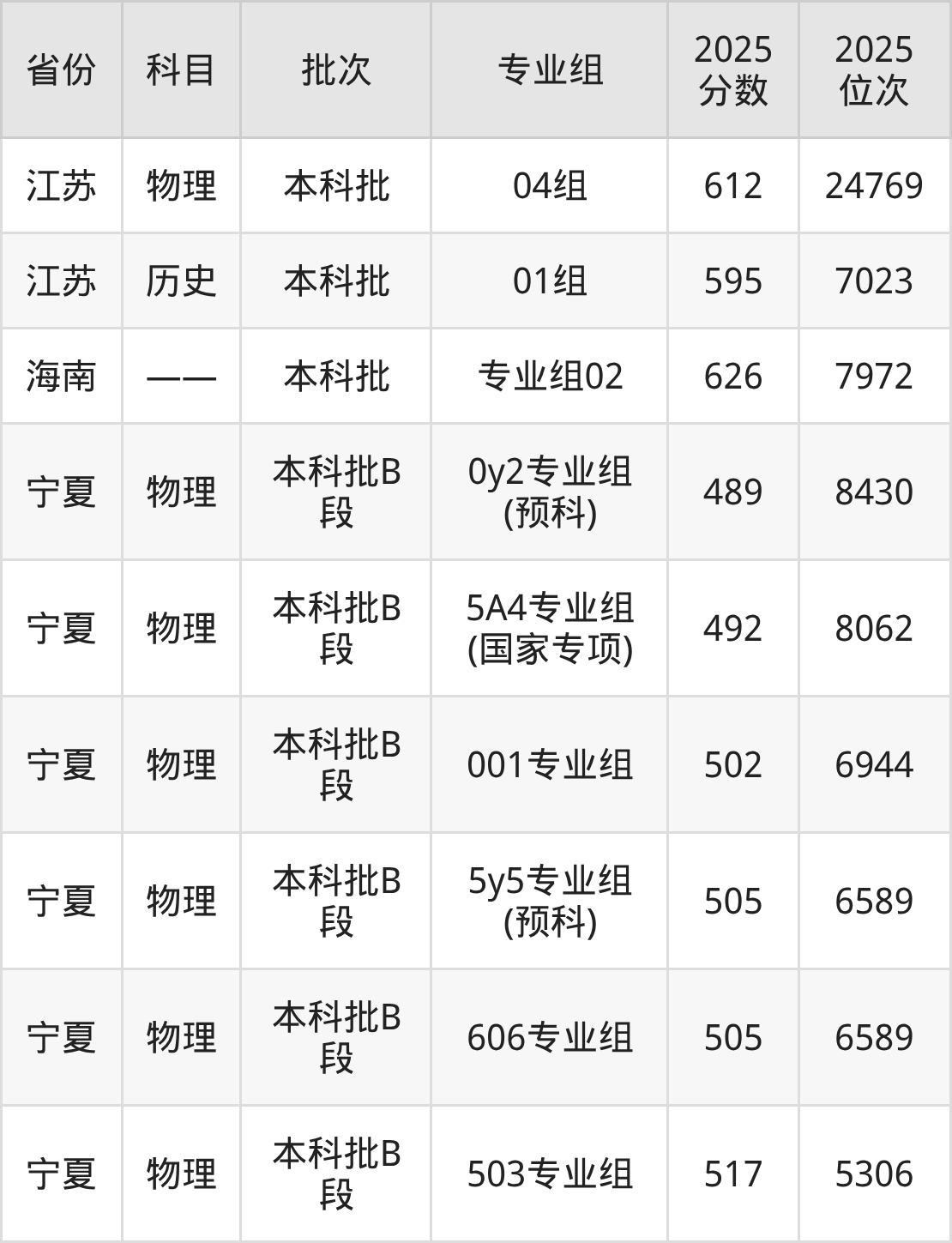 2025年在本科物理类进行招生,各专业组分数线详情如下: