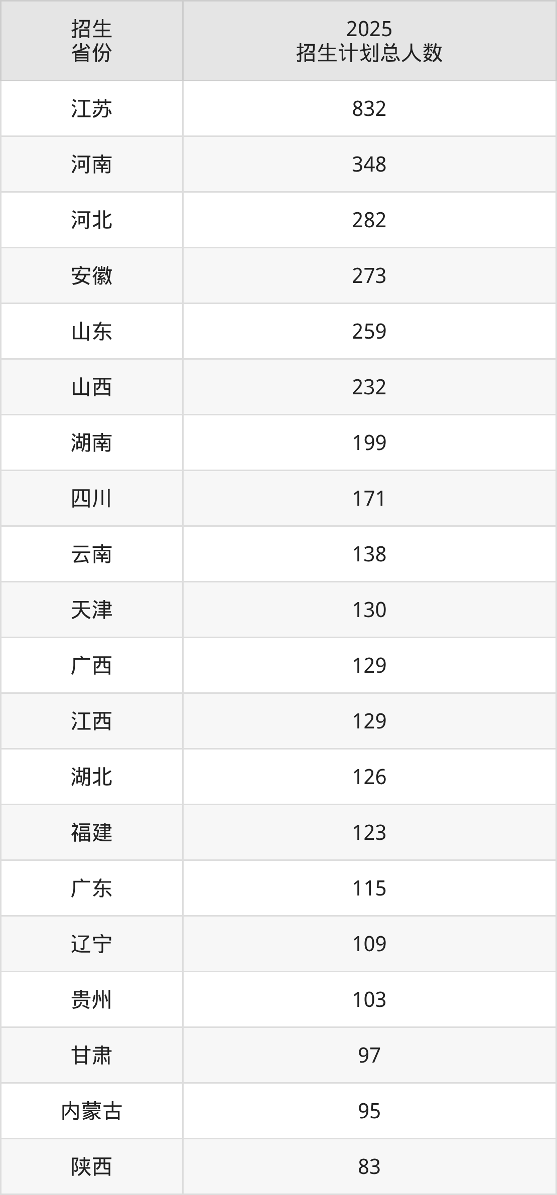 2025年南京农业大学面向全国29个省市开展本科招生;招生专业共56个,招生人数共4490人。2025年在江苏省招生计划总人数是832人,其中,南京农业大学在江苏省招生人数最多的是电子信息类。南京农业大学在各省具体招生人数情况如下表。