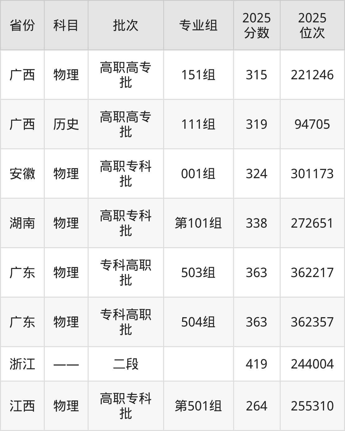 2025年在专科物理类进行招生,各专业组分数线详情如下: