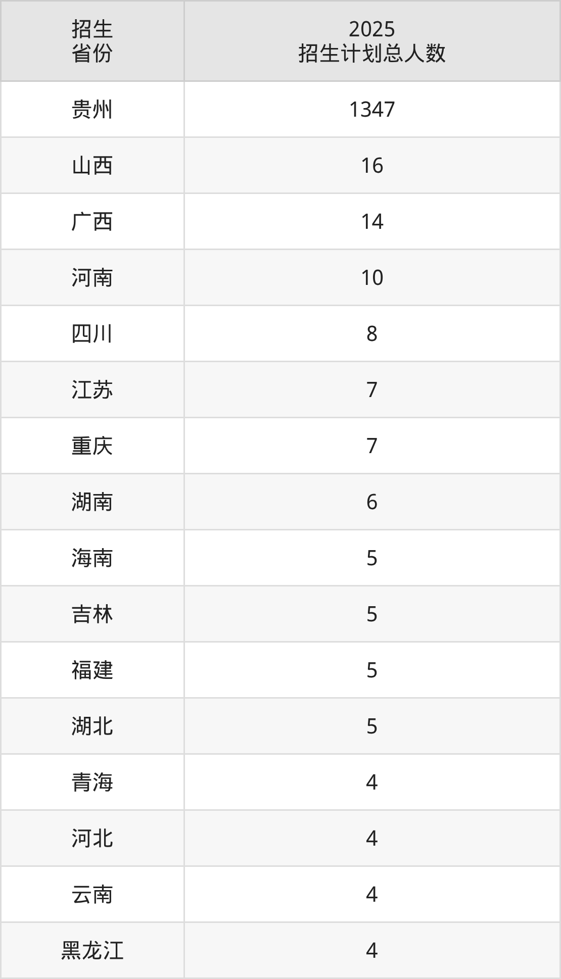 2025年黔南民族师范学院面向全国19个省市开展本科招生;招生专业共34个,招生人数共1457人。2025年在贵州省招生计划总人数是1347人,其中,黔南民族师范学院在贵州省招生人数最多的是计算机类。黔南民族师范学院在各省具体招生人数情况如下表。