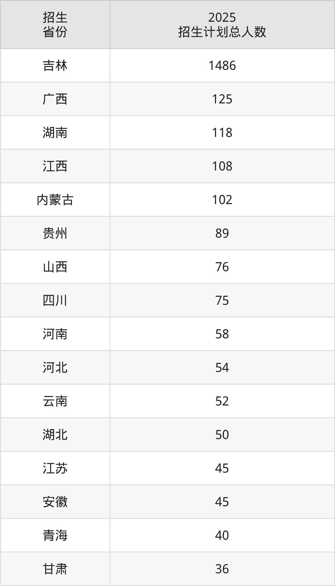 2025年长春师范大学面向全国26个省市开展本科招生;招生专业共49个,招生人数共2727人。2025年在吉林省招生计划总人数是1486人,其中,长春师范大学在吉林省招生人数最多的是计算机科学与技术。长春师范大学在各省具体招生人数情况如下表。