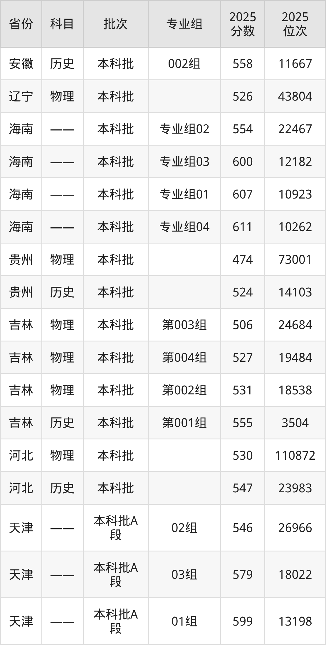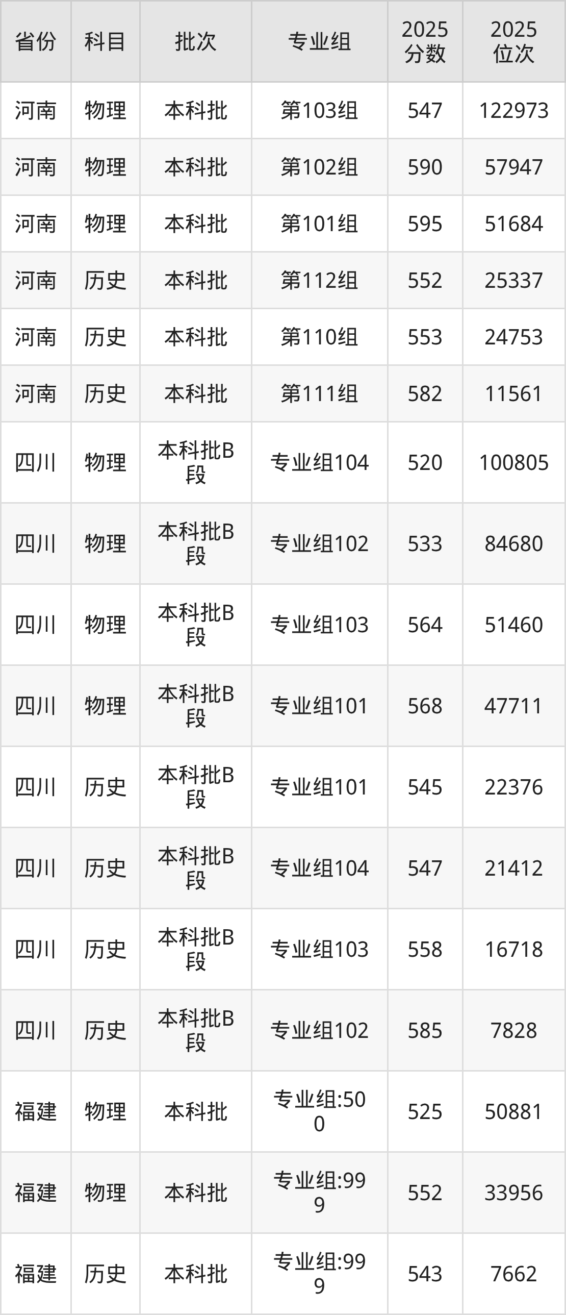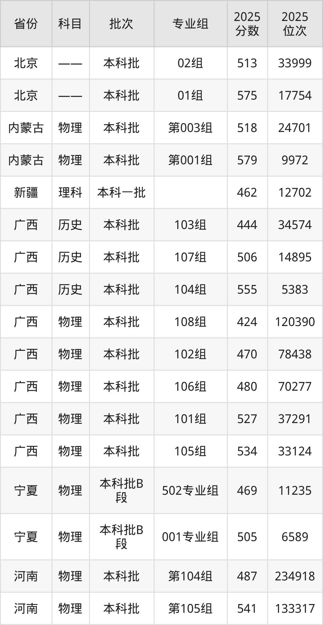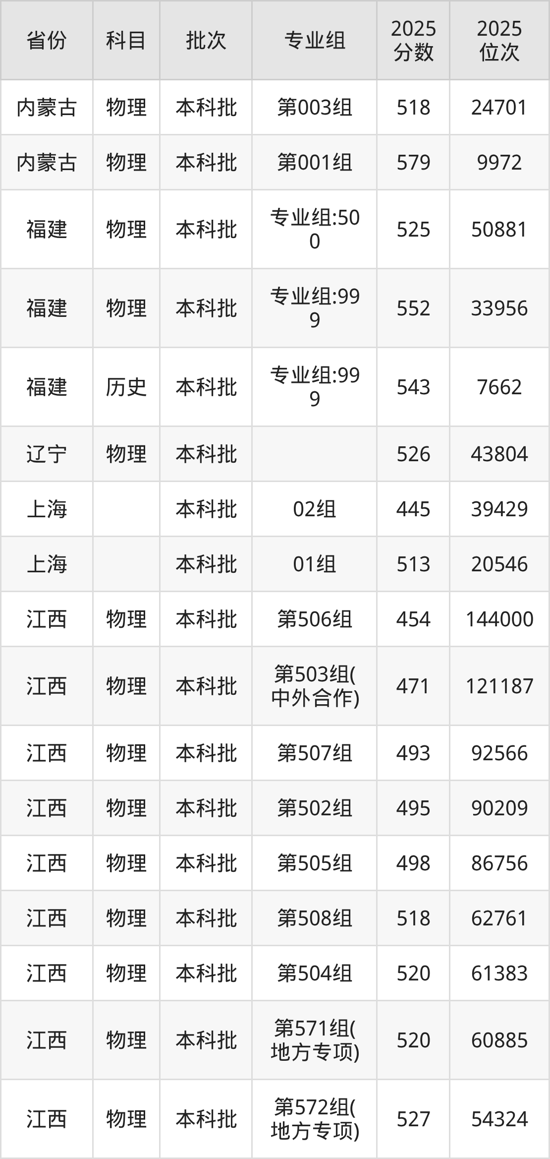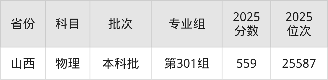 2025年在本科物理类进行招生,各专业组分数线详情如下: