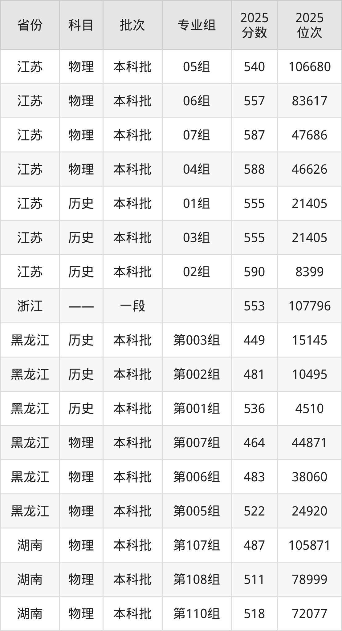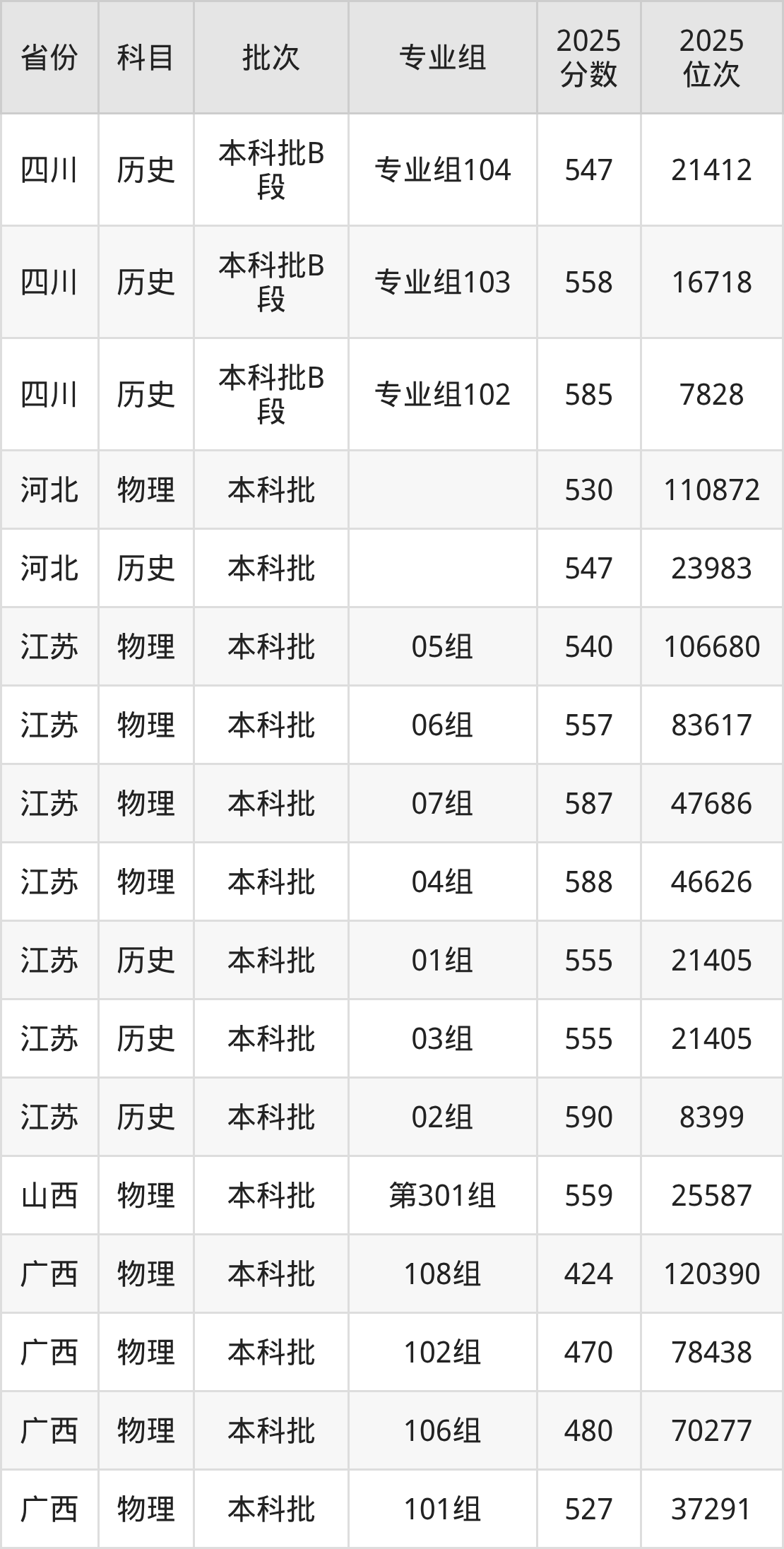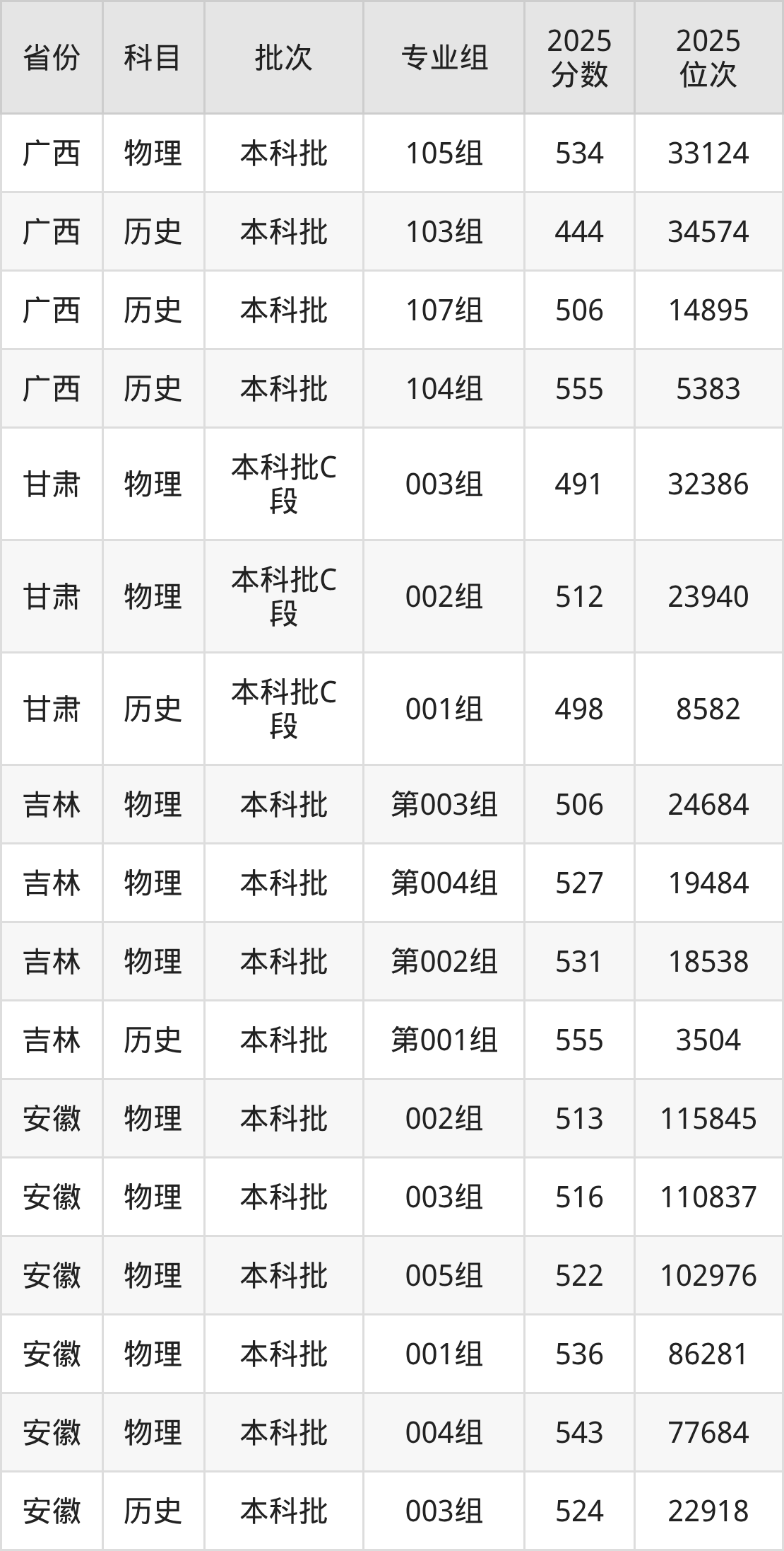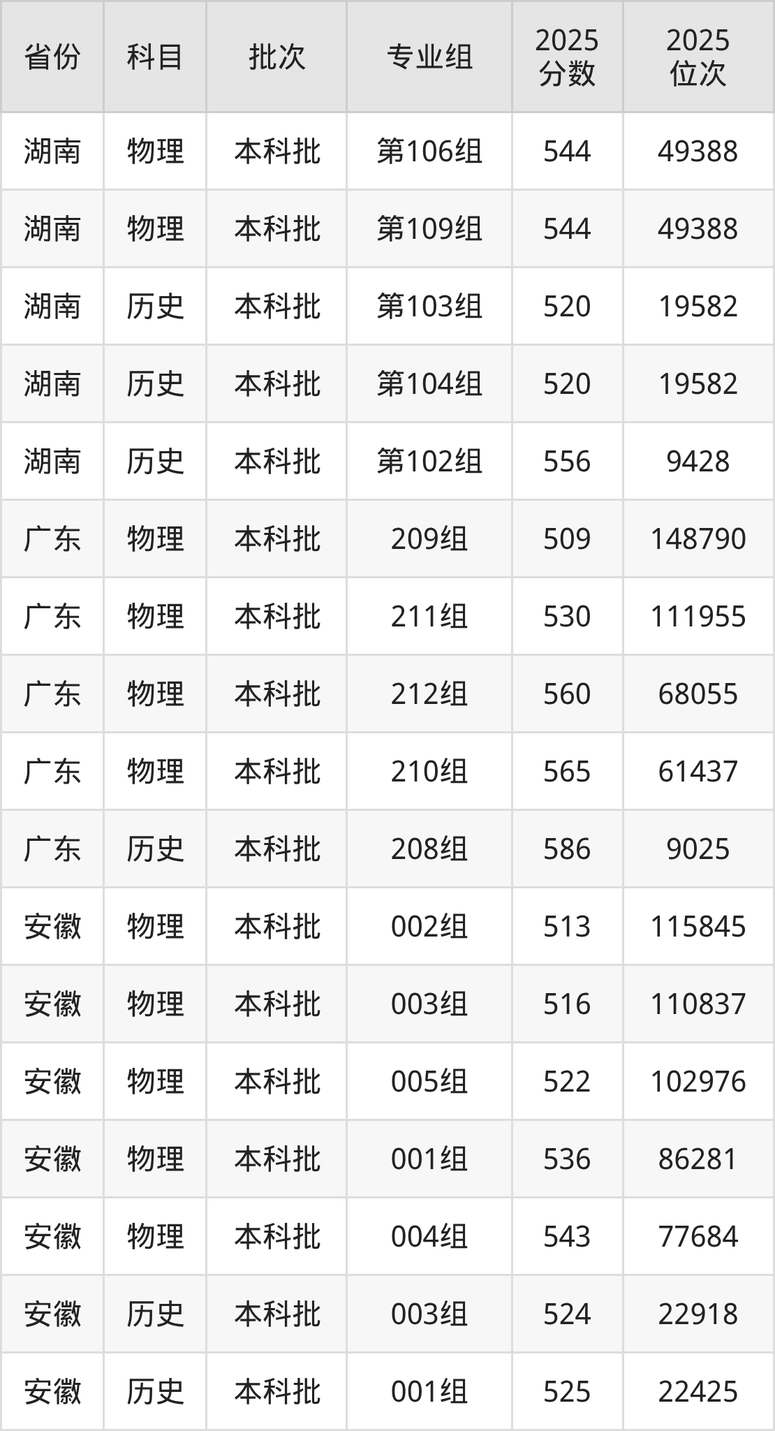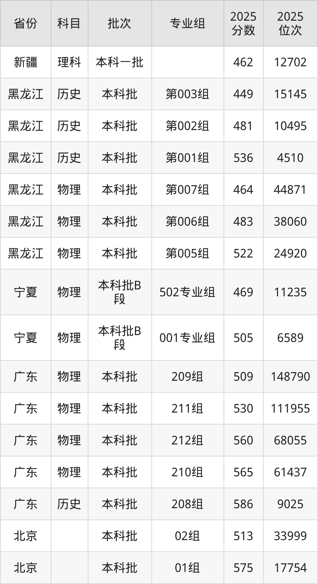 2025年在本科物理类进行招生,各专业组分数线详情如下: