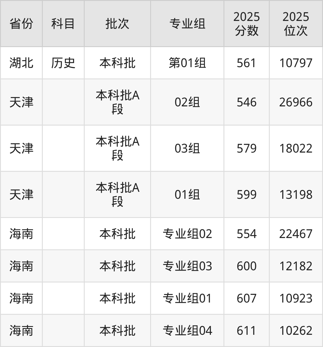 2025年在本科理科进行招生,各专业组分数线详情如下: